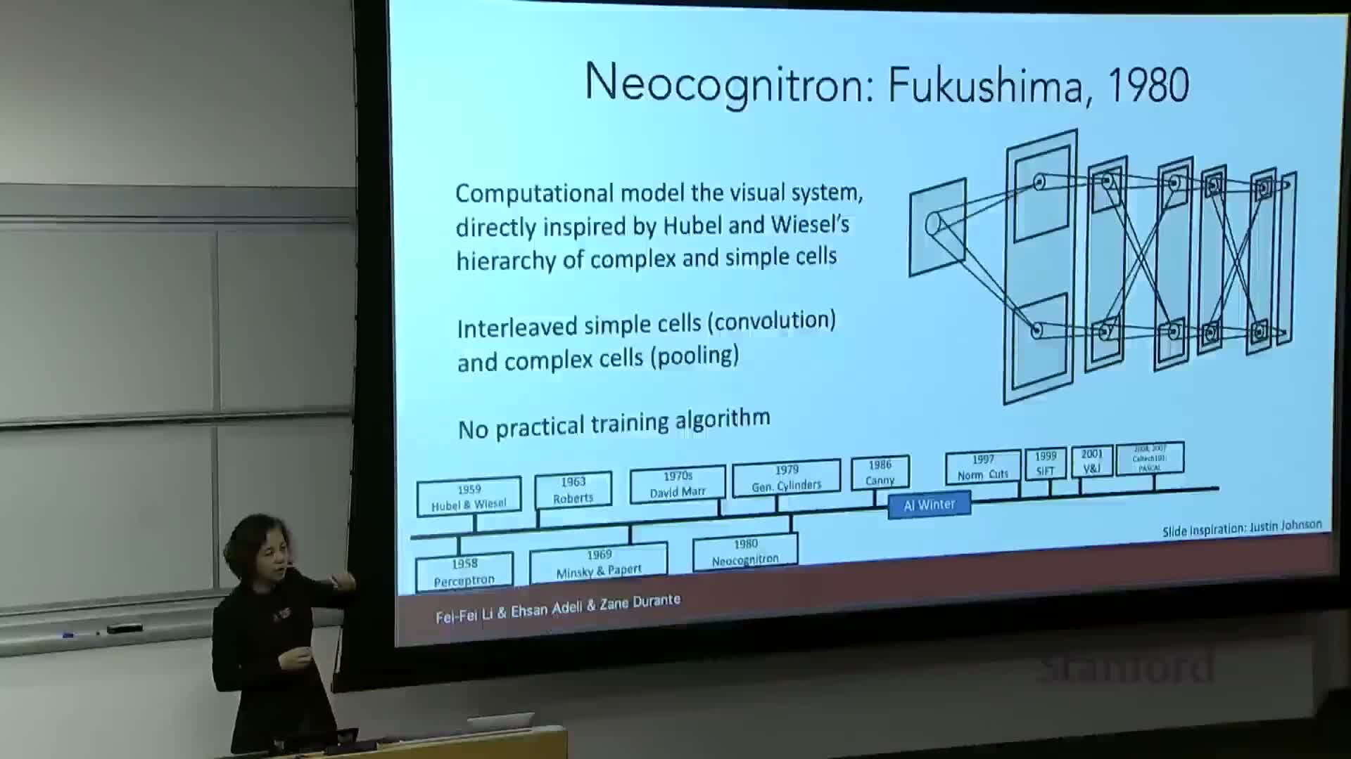 Neuroscience work by Hubel and Wiesel (1950s) revealed key properties of early visual cortex that inform computational design.