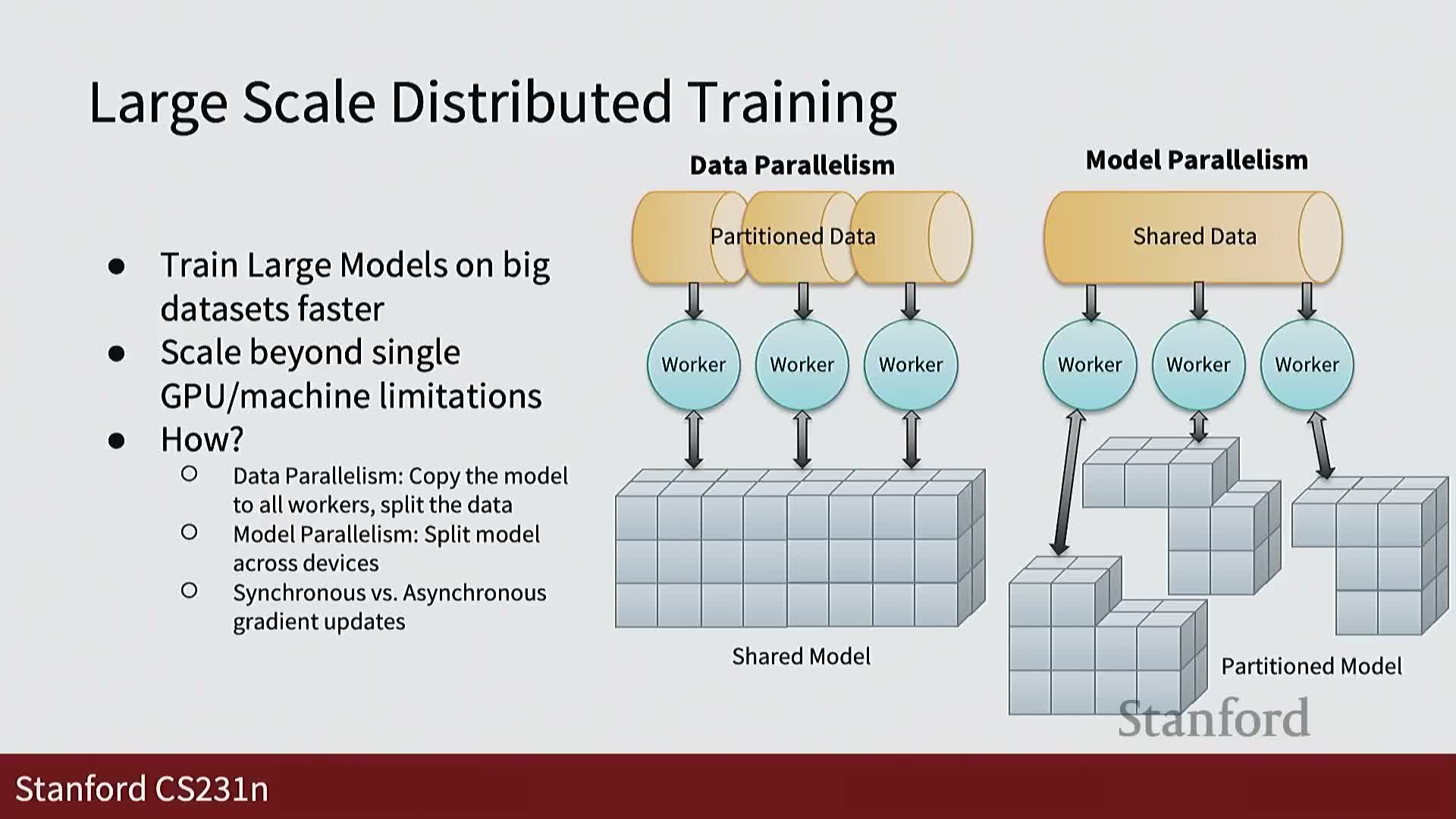 - Parallelism strategies: data parallelism and model parallelism to partition computation across devices and nodes.