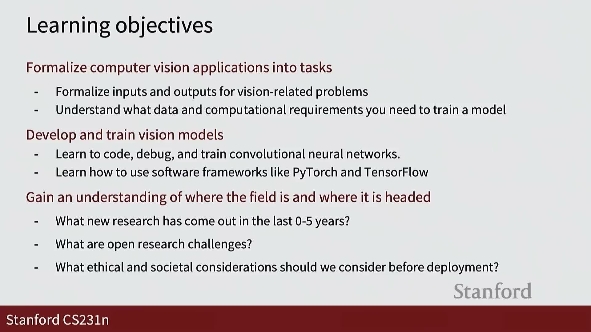 - Learning objectives include formalizing vision tasks, developing and training models for images and video, and understanding research trajectories and societal implications.