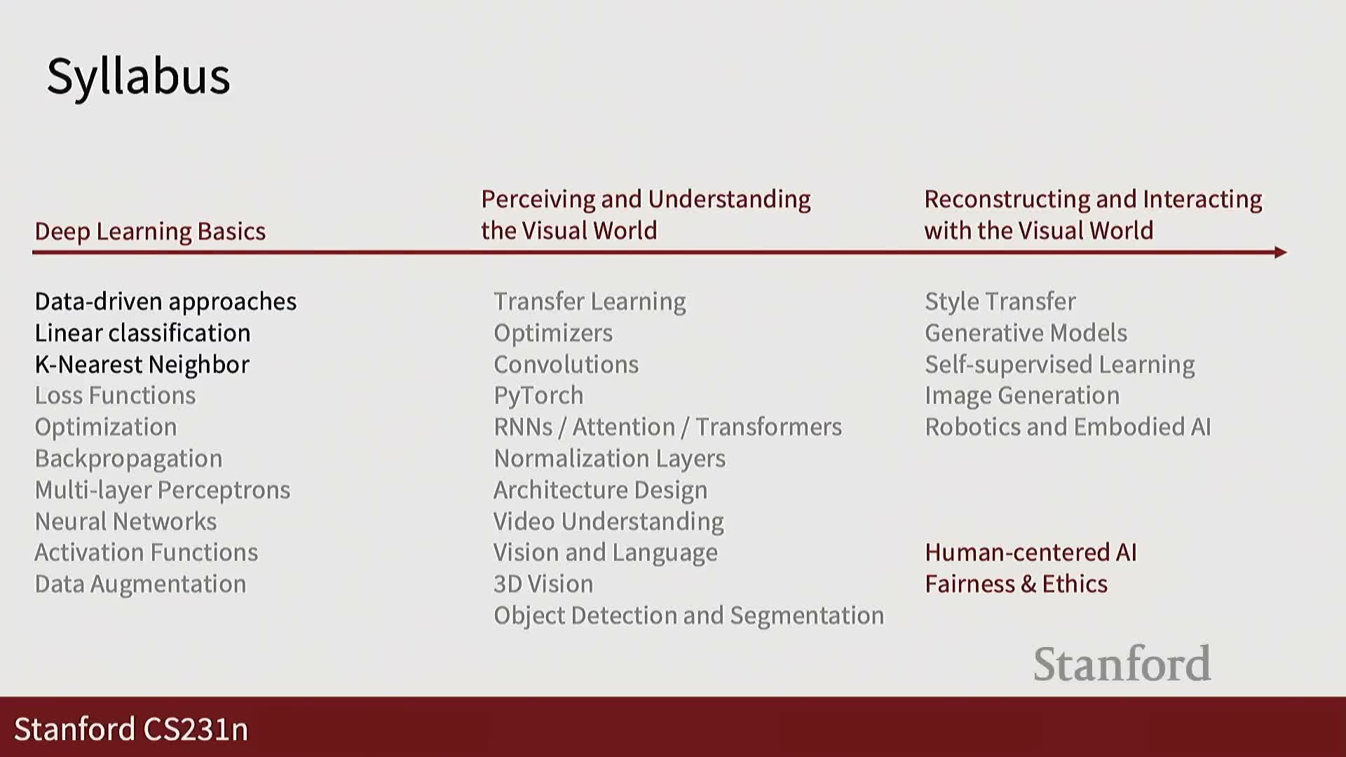 - The pedagogical arc moves from basic data-driven methods toward components used in modern deep learning.