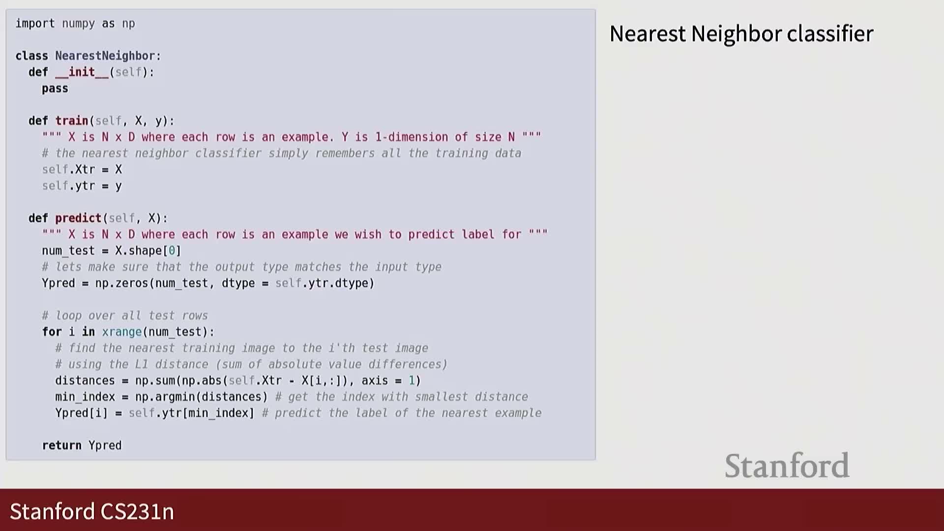 - The predict function computes a distance measure between a query and all stored training points, then assigns labels based on the most similar examples.