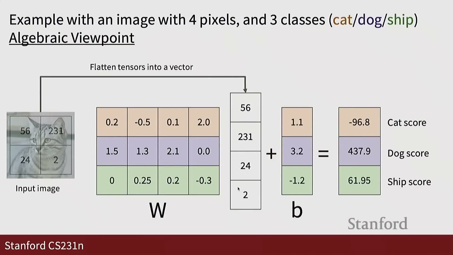 - Simplified 2×2 image example to illustrate linear scoring