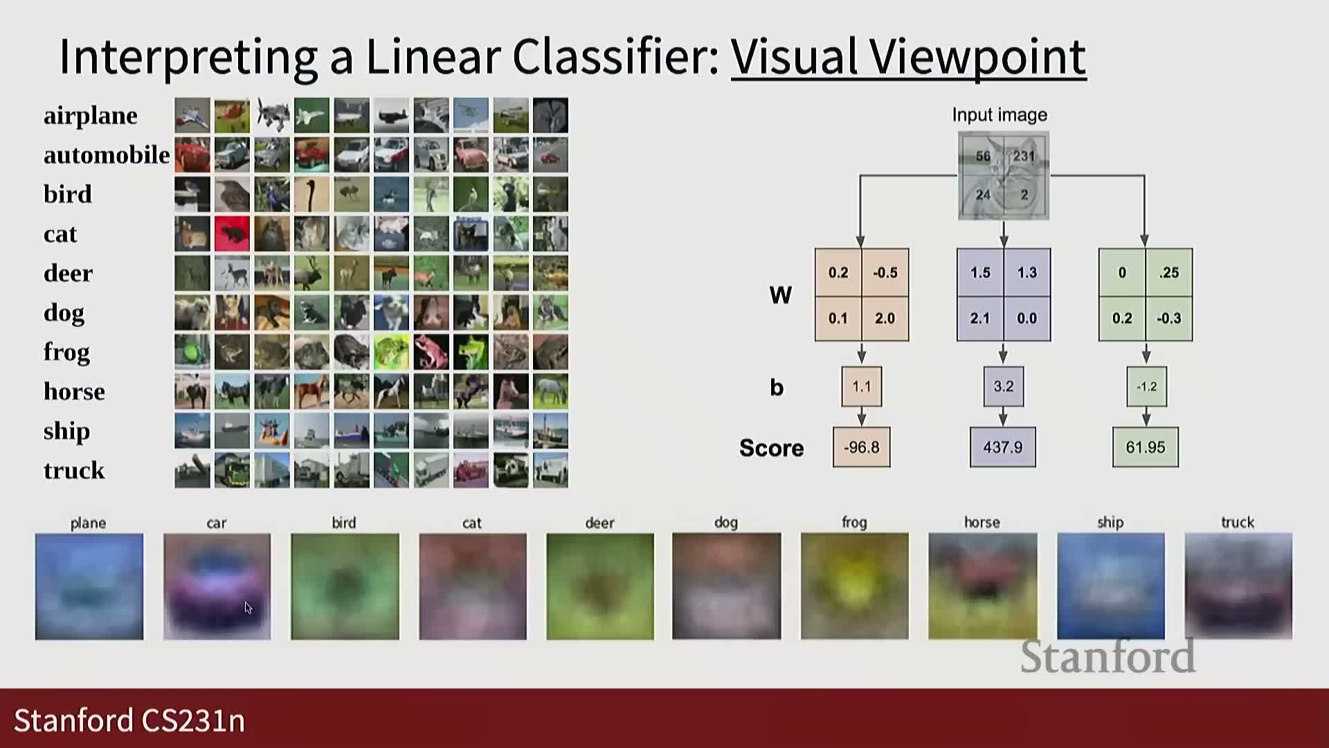 - Dimensions: W is C × D; each row of W is a linear template or scoring function for one class.