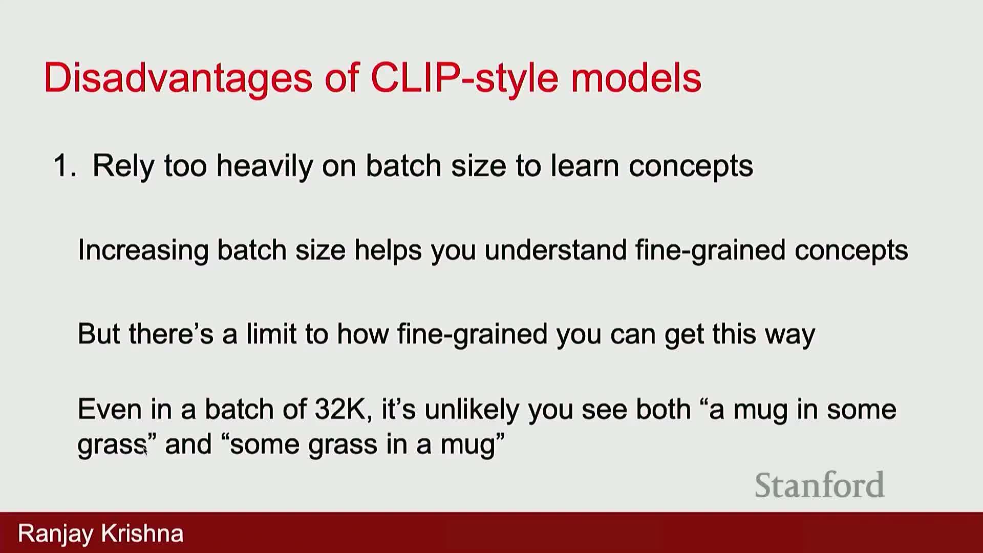 - CLIP struggles with compositionality and relational reasoning (e.g., distinguishing “mug in grass” from “grass in mug”).