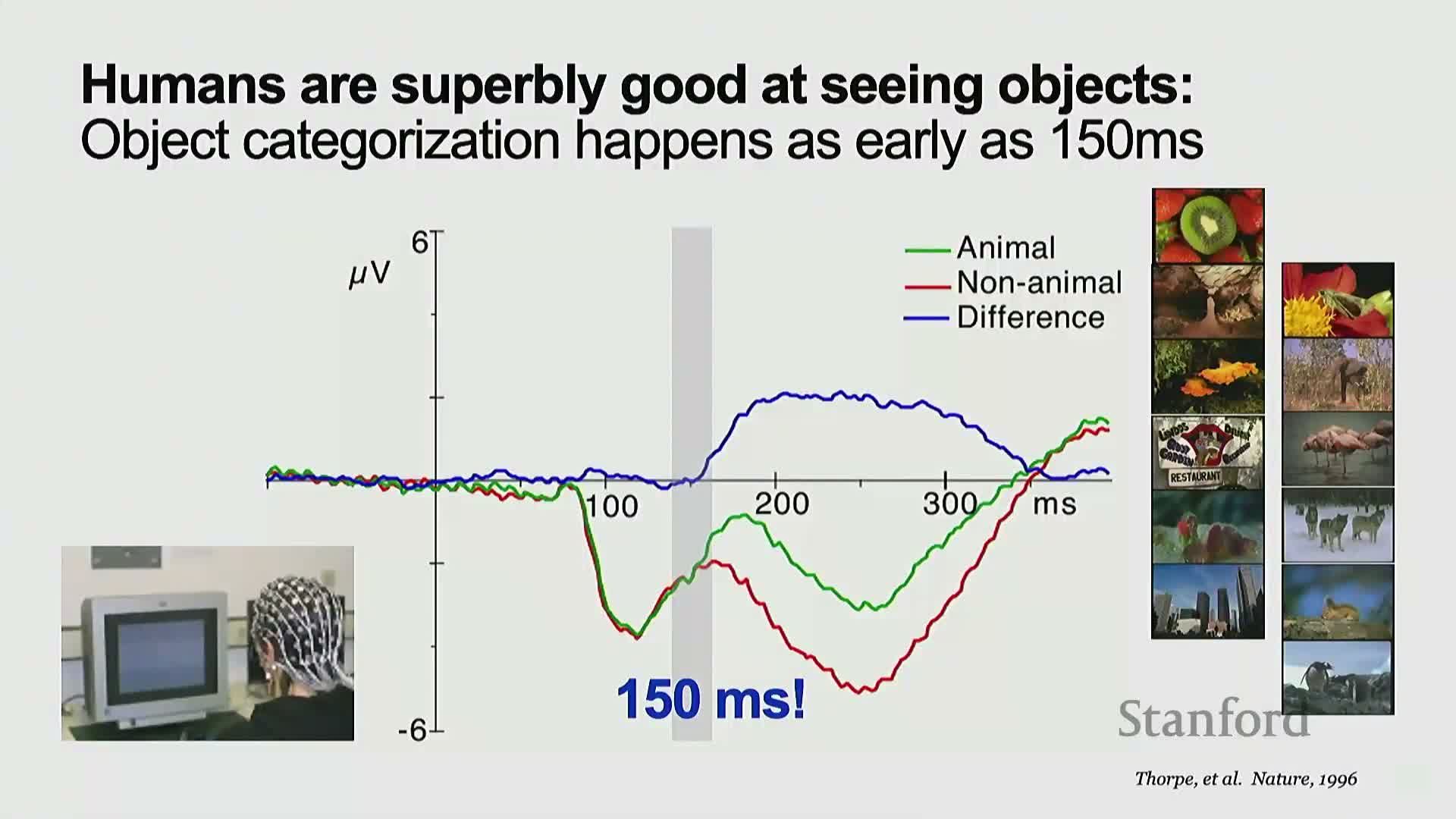 Fast, object-focused recognition — electrophysiological signals show categorical differentiation (e.g., animal vs. non-animal) within ~150 ms of stimulus onset.