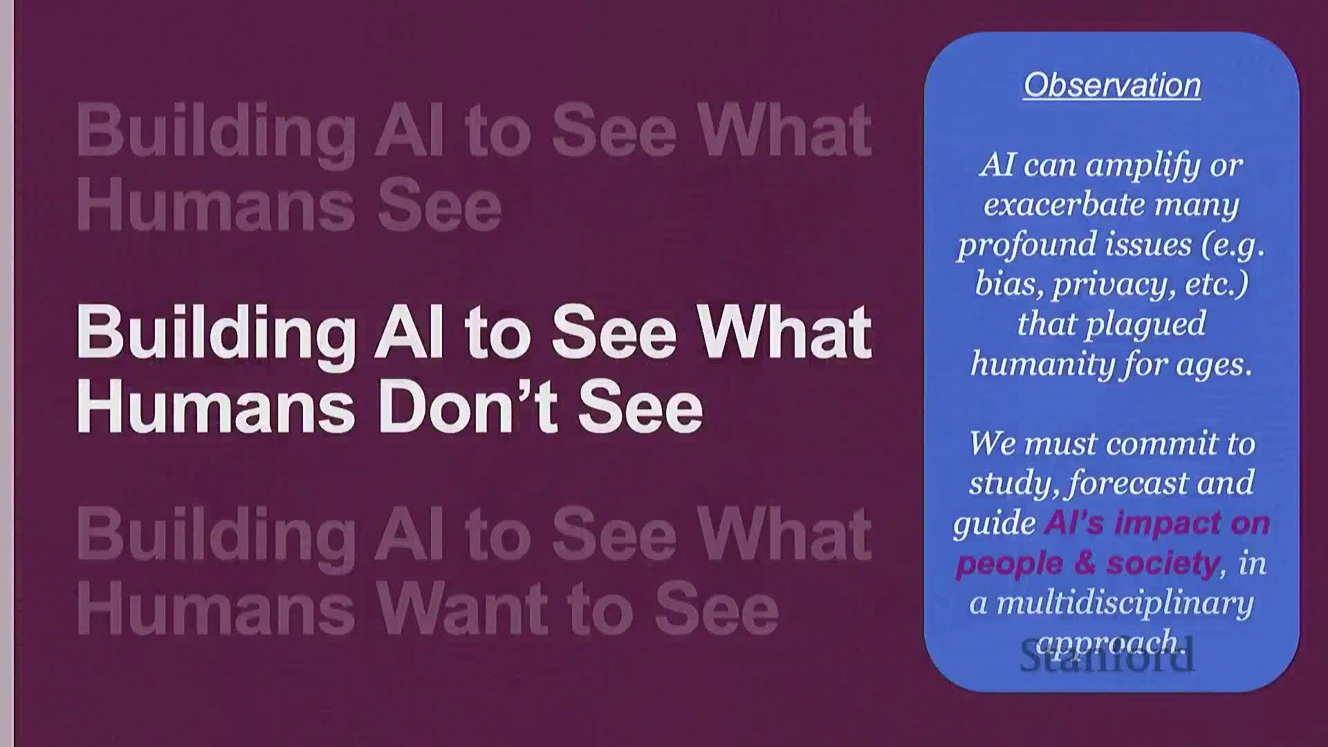 - AI can both amplify human capabilities and amplify human biases, so human-centered values must guide AI development and deployment.