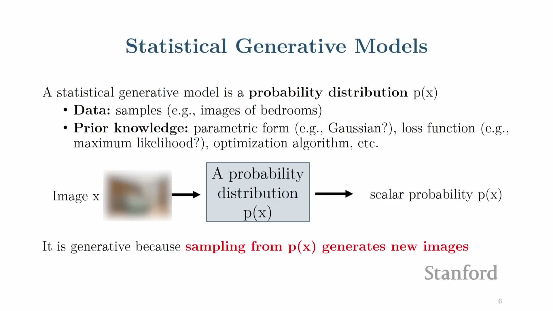 Generative models are formalized as probability distributions over observations that combine data-driven learning with prior knowledge (architectural biases, loss choices).