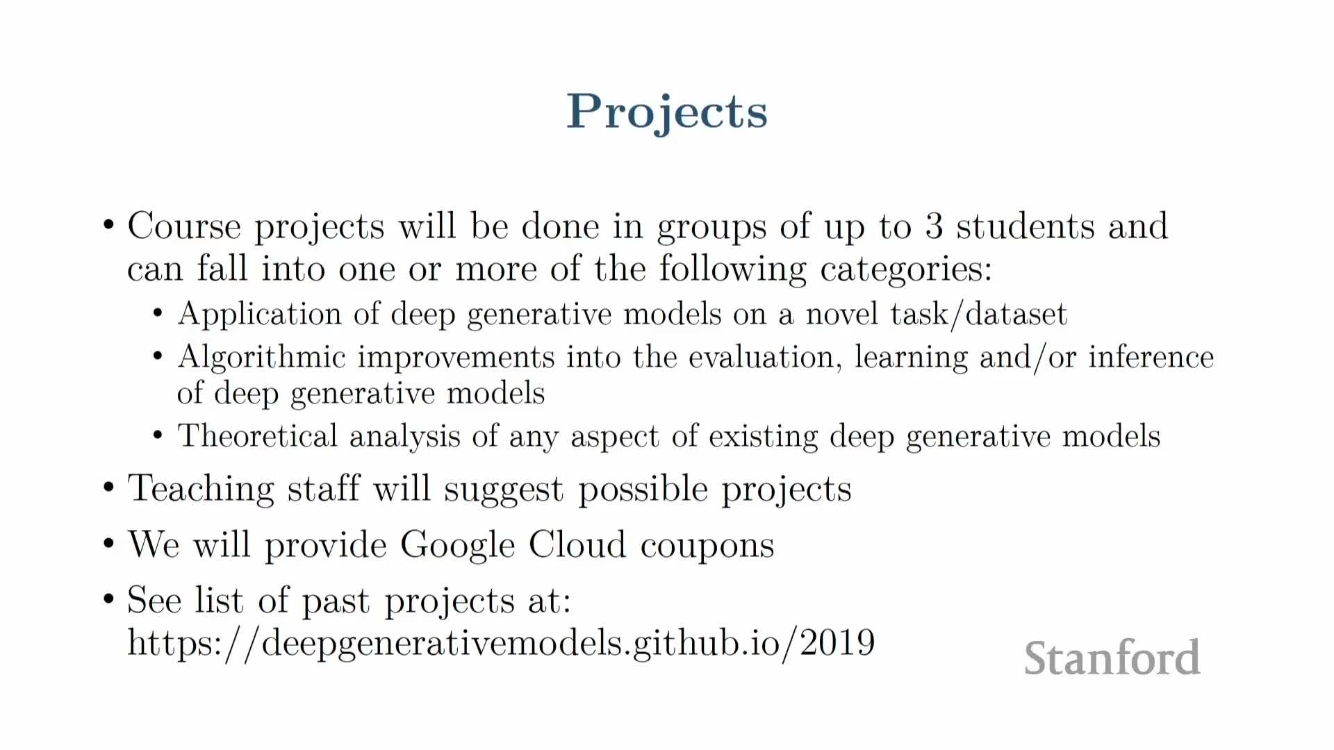 Projects typically involve applying or extending generative models to new datasets, comparing methods, or contributing methodological improvements. The project emphasizes hands-on experimentation, potential for publishable results, and exploration of open research questions. Limited cloud credits and suggested project ideas are made available to support student work.