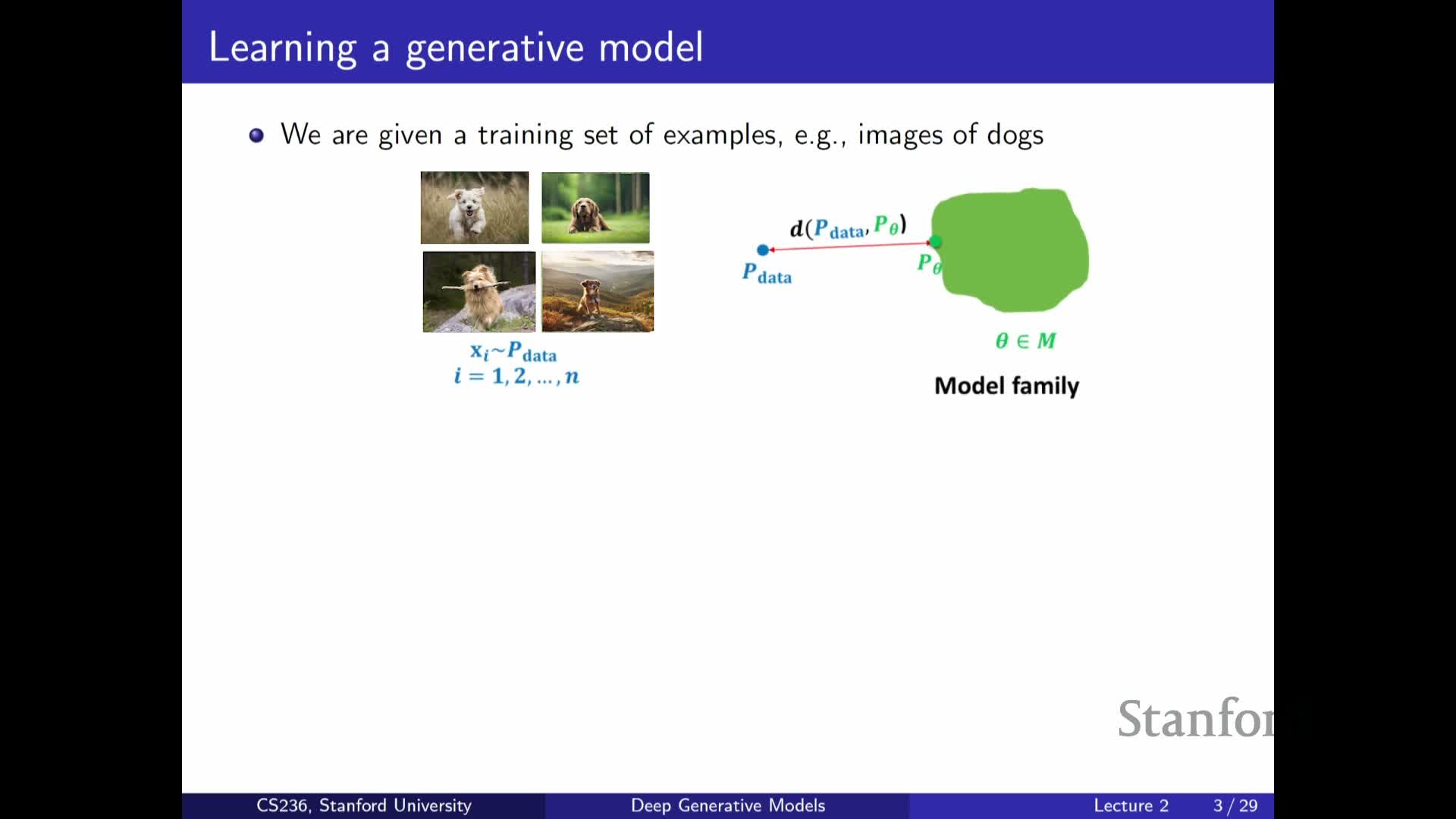 The overview frames subsequent material around three components needed for generative modeling: data, a model family, and a similarity / loss metric.