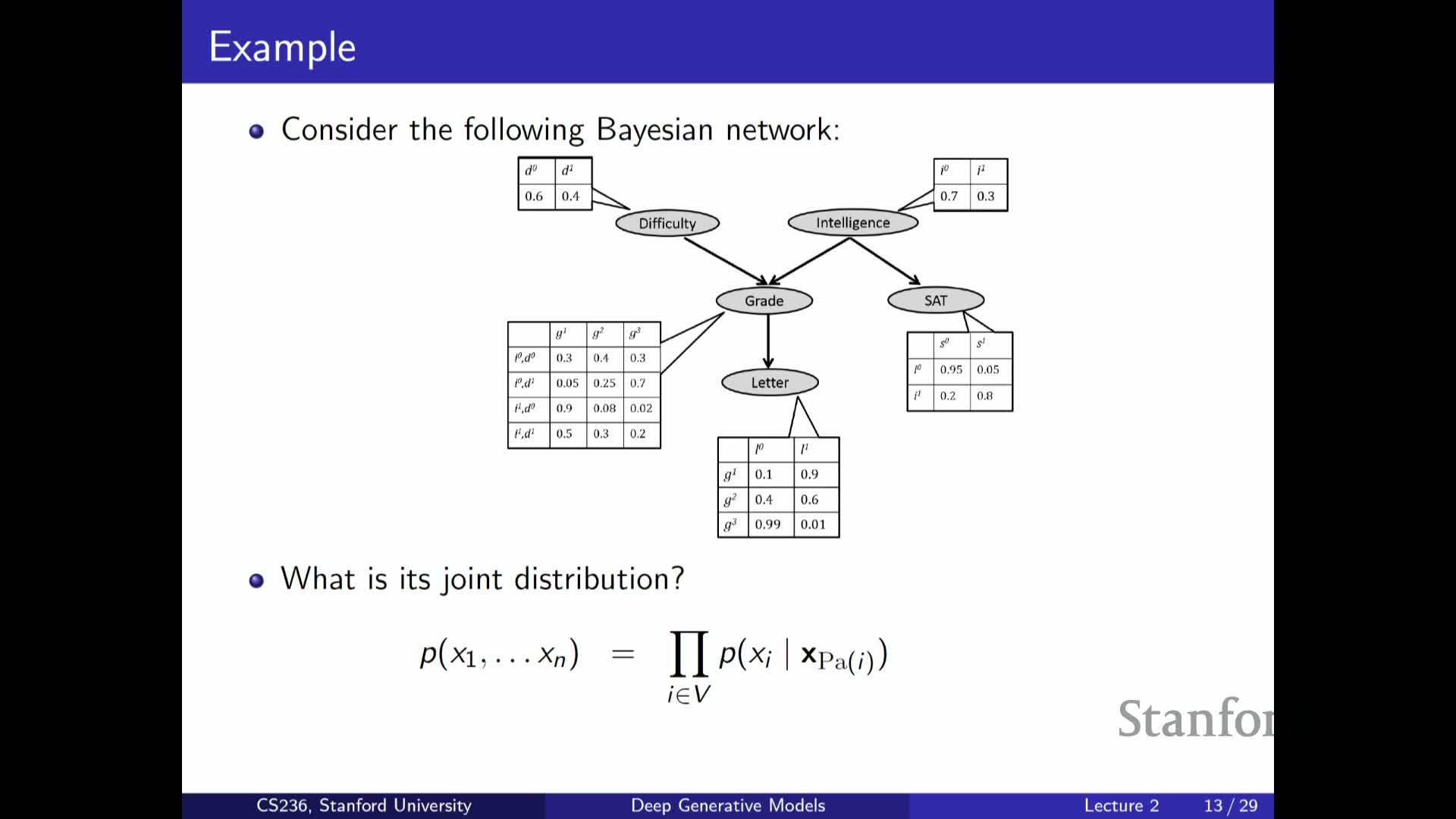 - The joint factorizes into local conditionals according to the DAG (some nodes have no parents → marginals; others depend on a subset of variables).