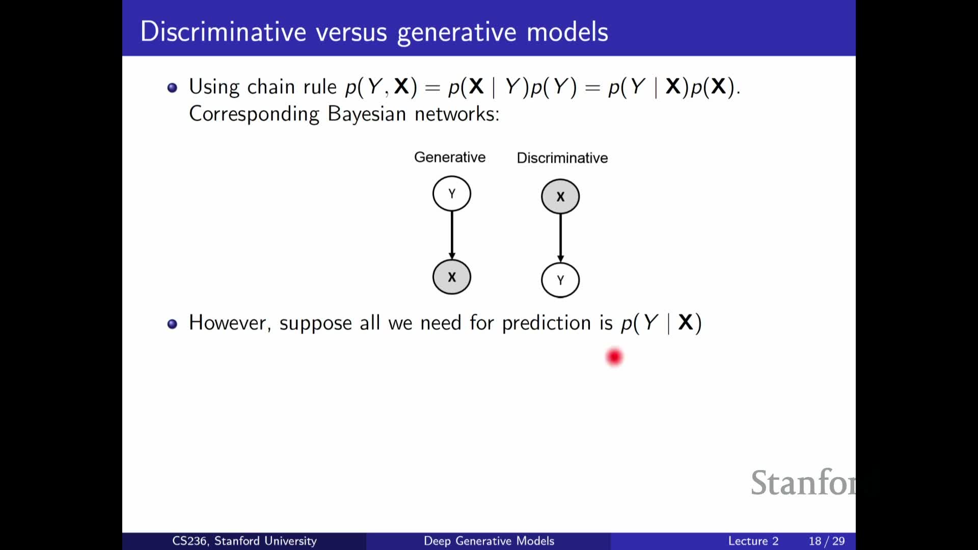 Generative models: model the full joint P(X, Y) (e.g., **P(Y) P(X Y)) or other factorizations, supporting broader tasks such as **sampling, imputation, and density estimation.