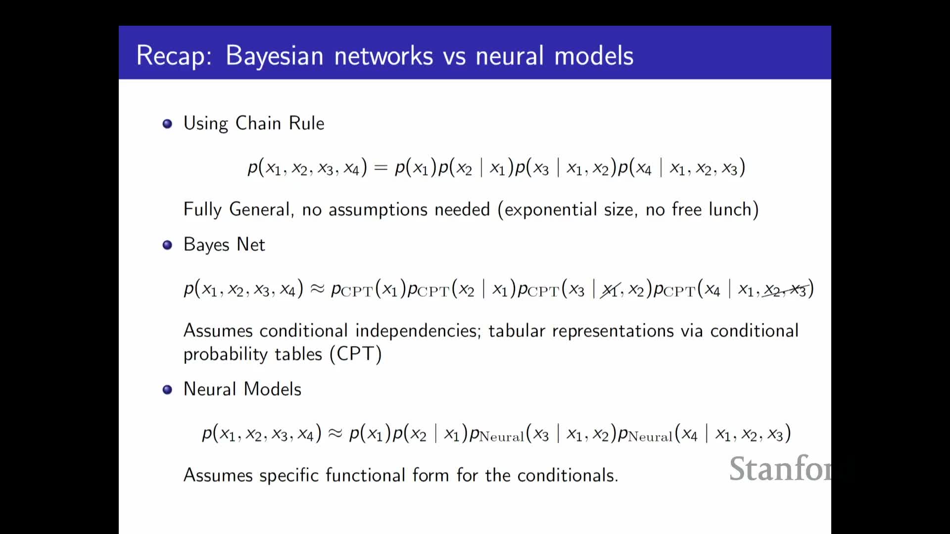 - Neural parameterizations replace tabular conditional probability tables, making estimation tractable for complex dependencies.