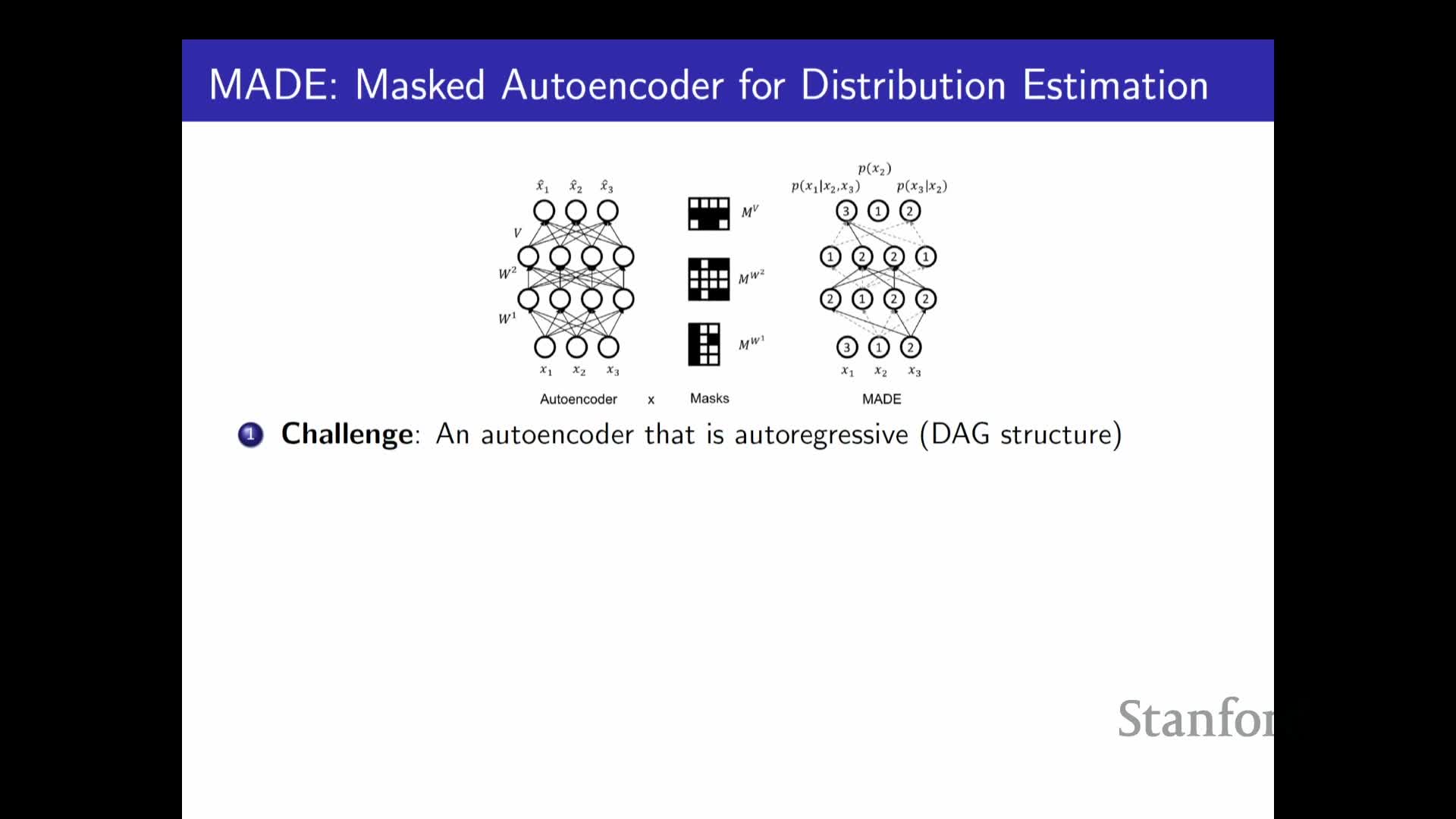 - Apply weight masks so each output unit depends only on allowed input indices (i.e., previous variables in the chosen ordering).