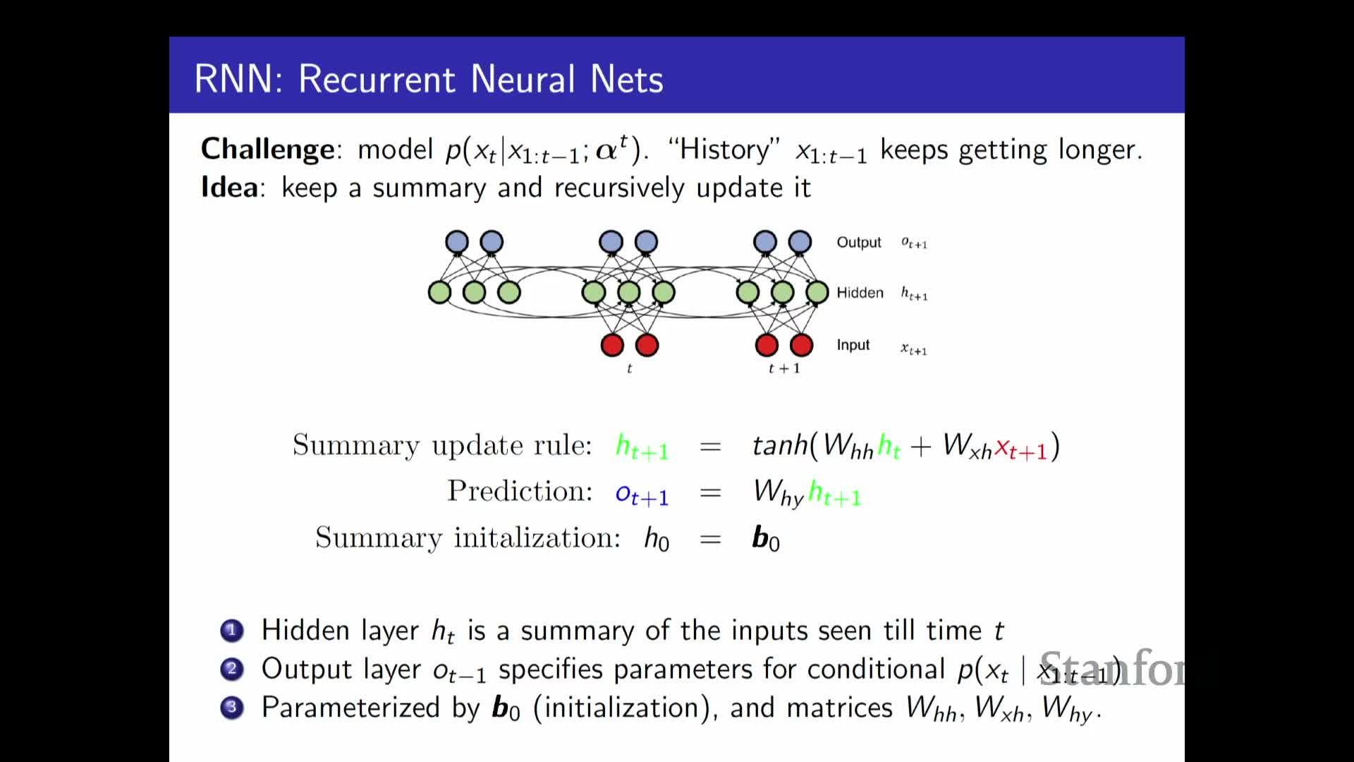 - The RNN summarizes past variables into a fixed-size hidden state via recurrent updates.