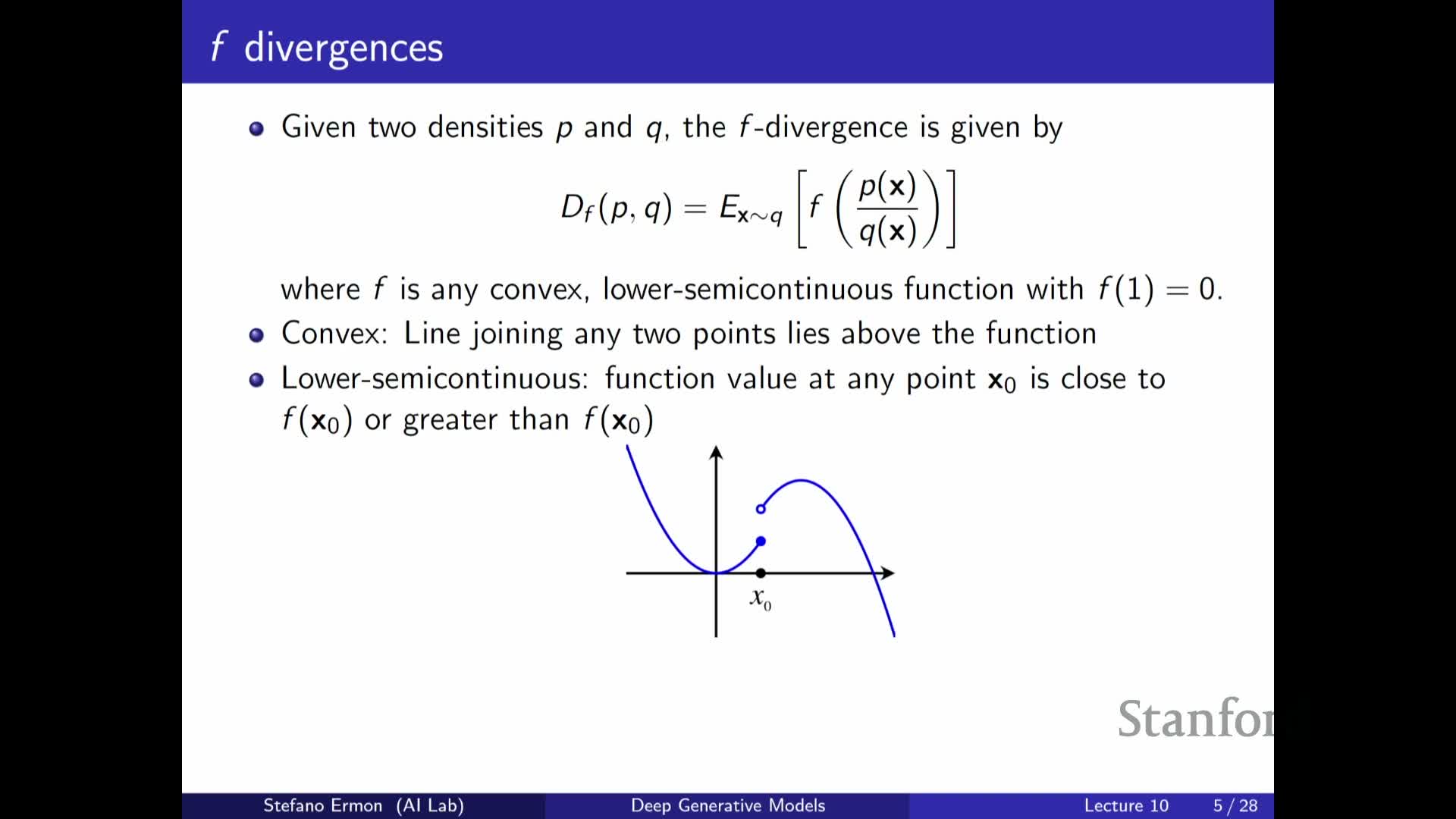 Key properties of f: it must be convex, lower semi-continuous, and satisfy f(1) = 0, which ensures non-negativity of the divergence and zero value iff P = Q under mild conditions.