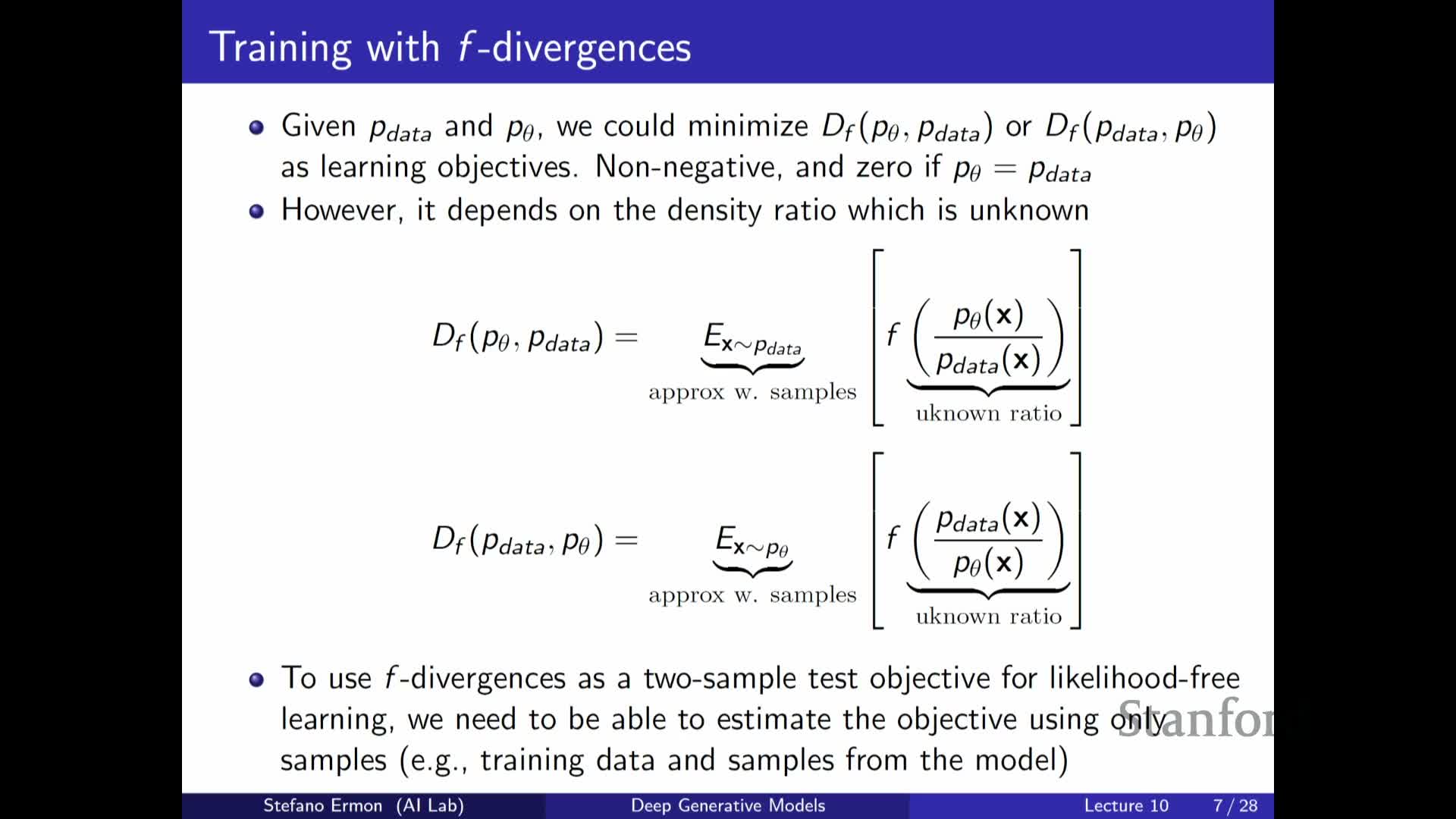 - In practical likelihood-free scenarios the data density p_data is unknown and implicit models do not provide tractable q(x), so the divergence cannot be computed directly.