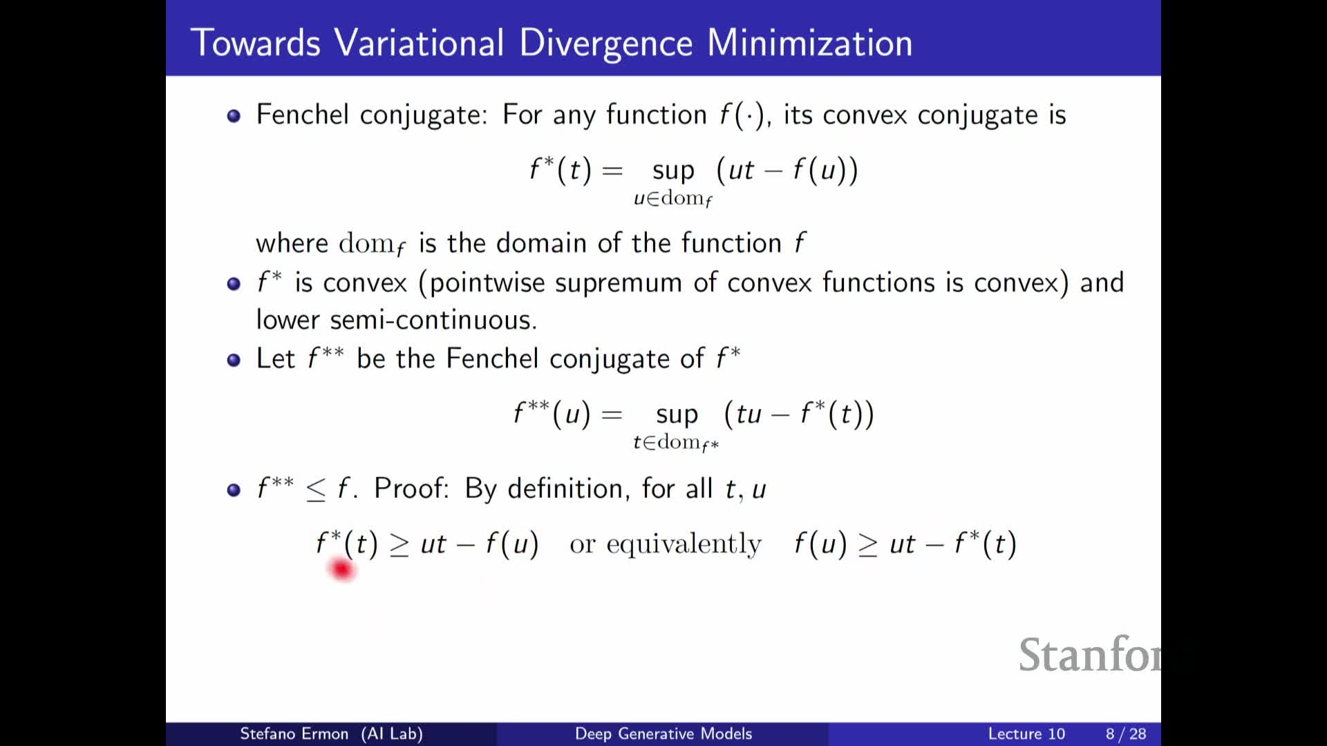 - The biconjugate f** is a lower bound to f, with equality when f is convex and lower semi-continuous.
