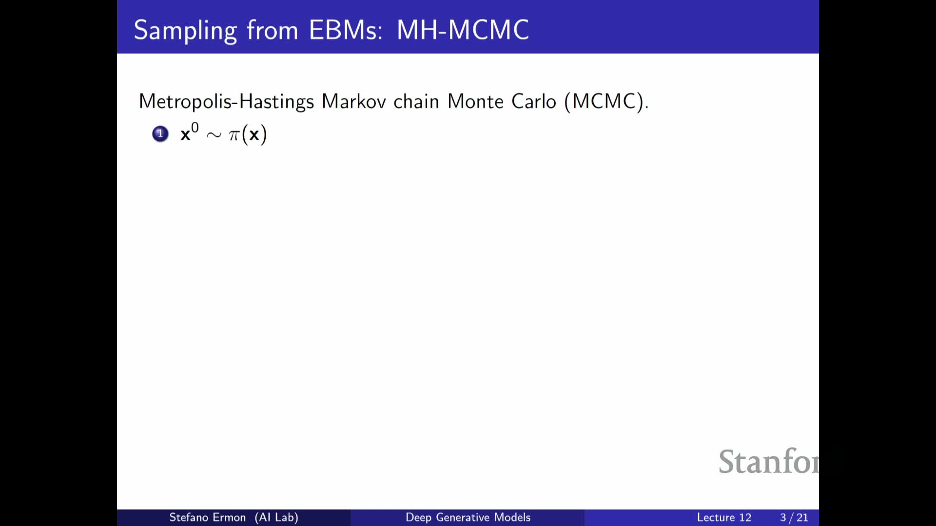 Markov chain Monte Carlo (MCMC) methods enable sampling from EBMs via local proposals and acceptance rules that satisfy detailed balance