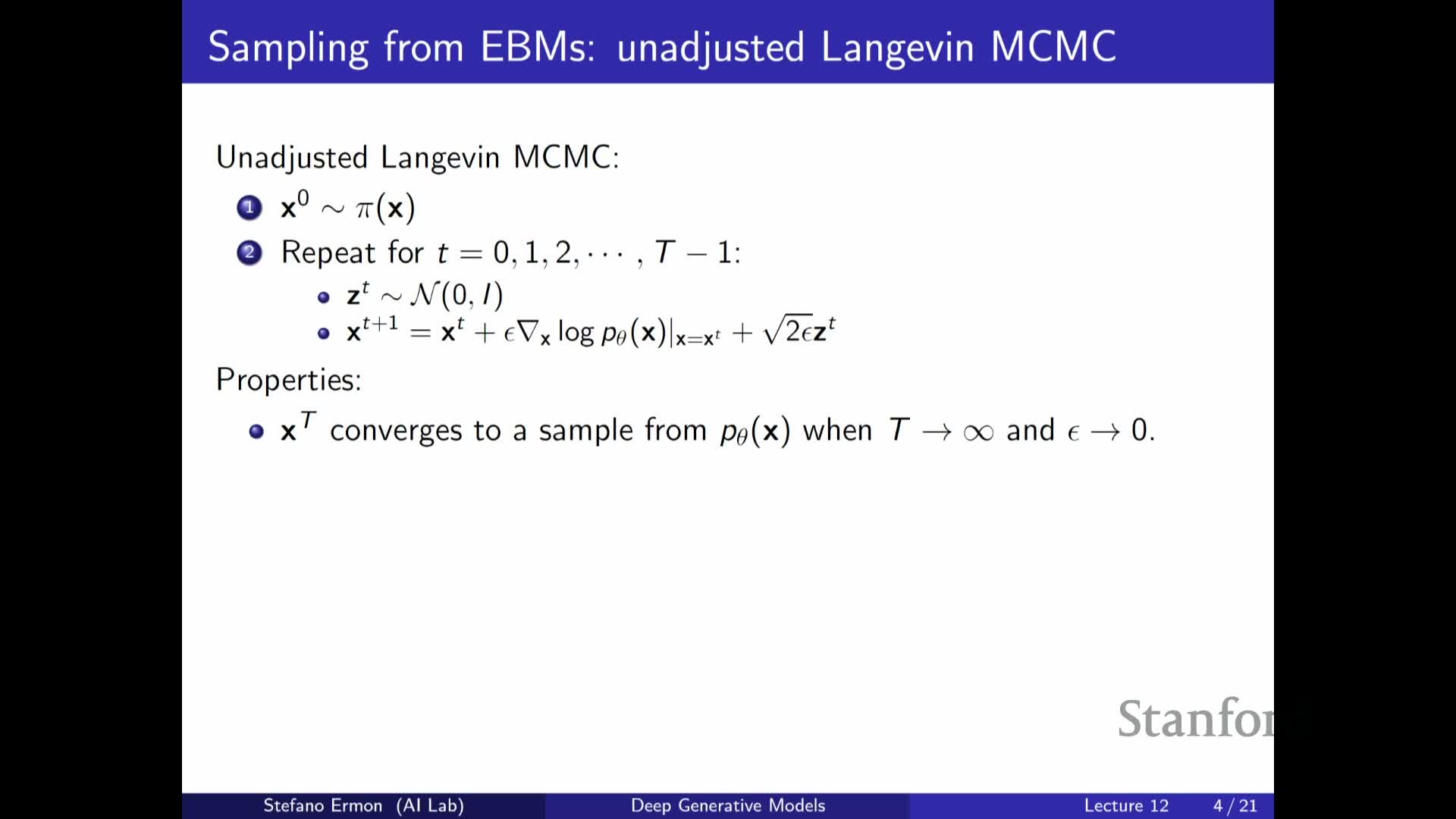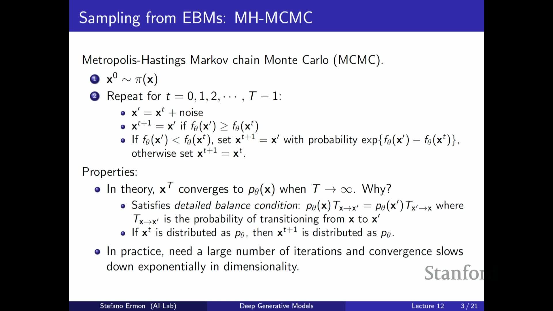Sampling from an EBM is typically done by constructing a Markov chain whose transition operator satisfies detailed balance with respect to p_theta.