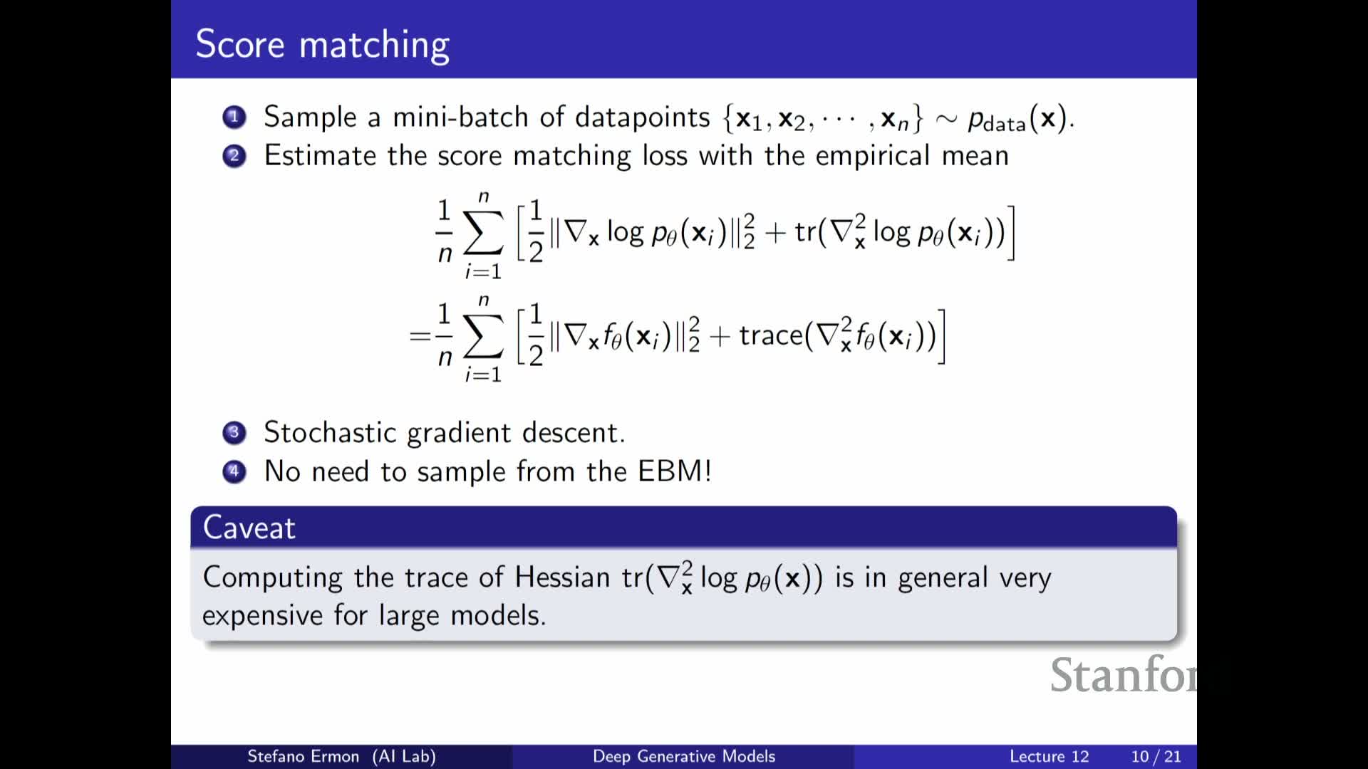 Practical computation of the score-matching loss requires approximations for second derivatives and scalable estimators such as sliced or denoising score matching