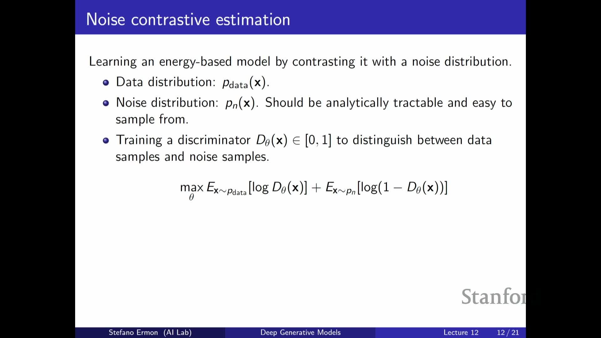 Noise-contrastive estimation (NCE) reframes density estimation as a supervised binary classification problem: a discriminator learns to distinguish real data from samples drawn from a chosen noise distribution p_n(x).