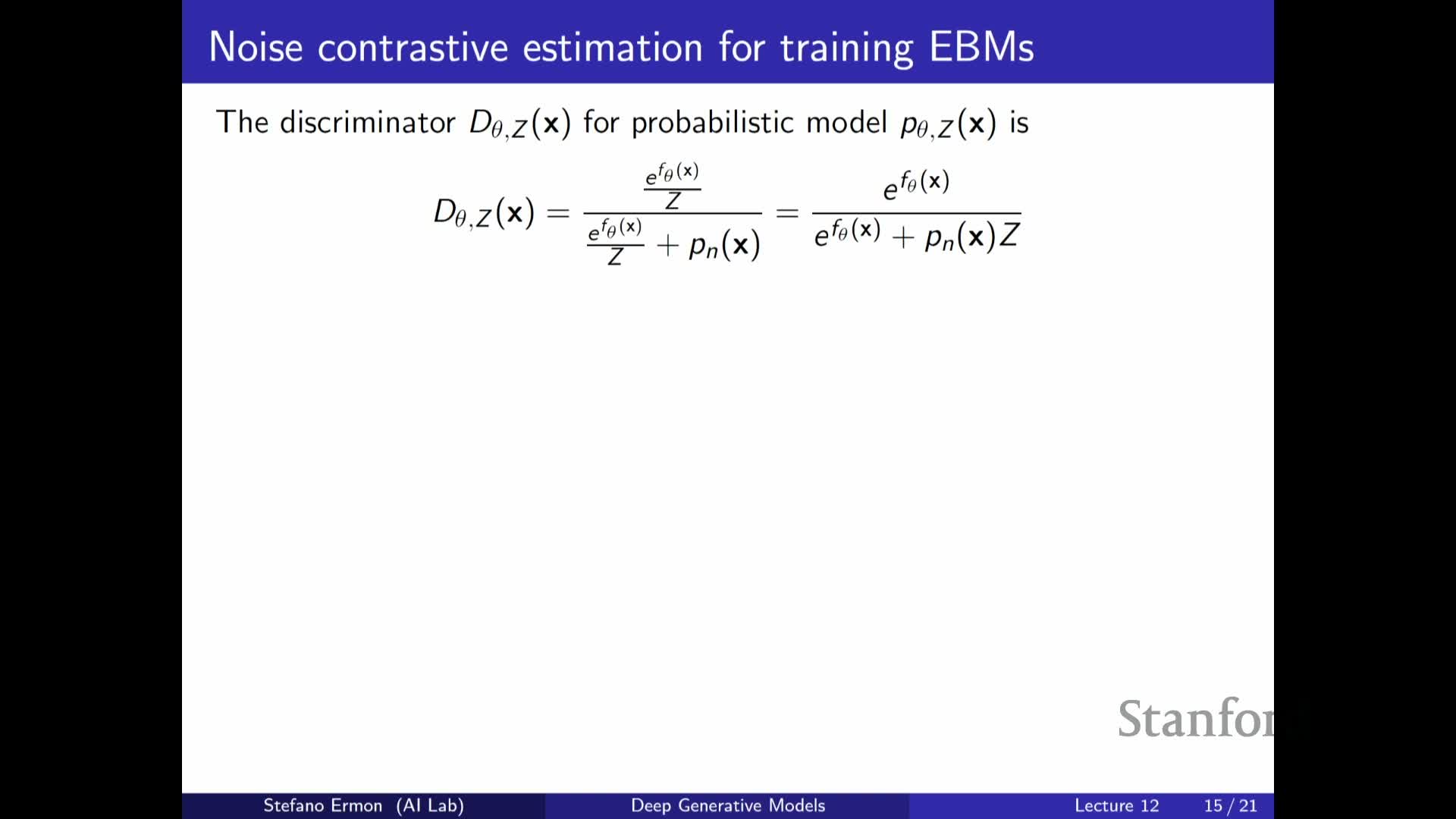 NCE can be specialized to EBMs by parameterizing the classifier’s model likelihood term with p_theta(x) = exp(f_theta(x)) / Z and treating log Z as an additional free scalar parameter z that is optimized jointly with theta.