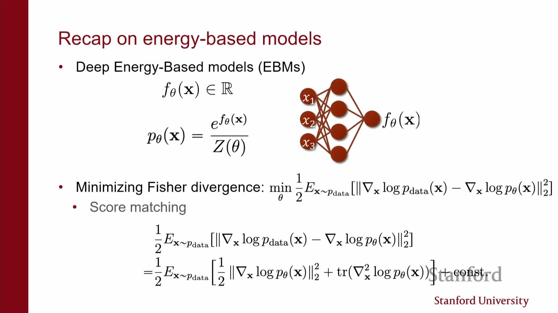Crucially, the score (the gradient of the energy) does not depend on the partition function, so matching scores avoids normalization issues.