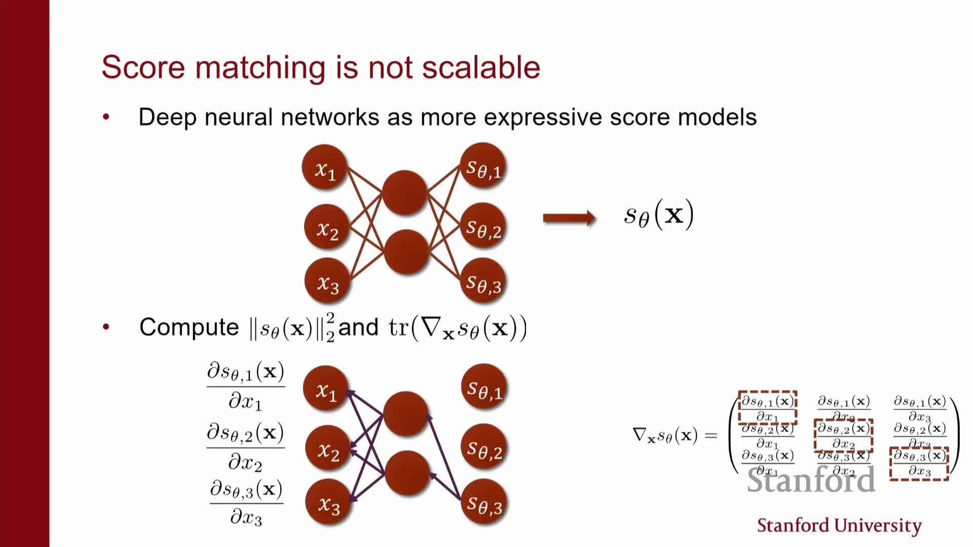 - The problematic term is the trace of the Jacobian (sum of ∂(s_theta)_i / ∂x_i), which, if computed naively, requires O(d) backpropagations and becomes intractable in high-dimensional data.