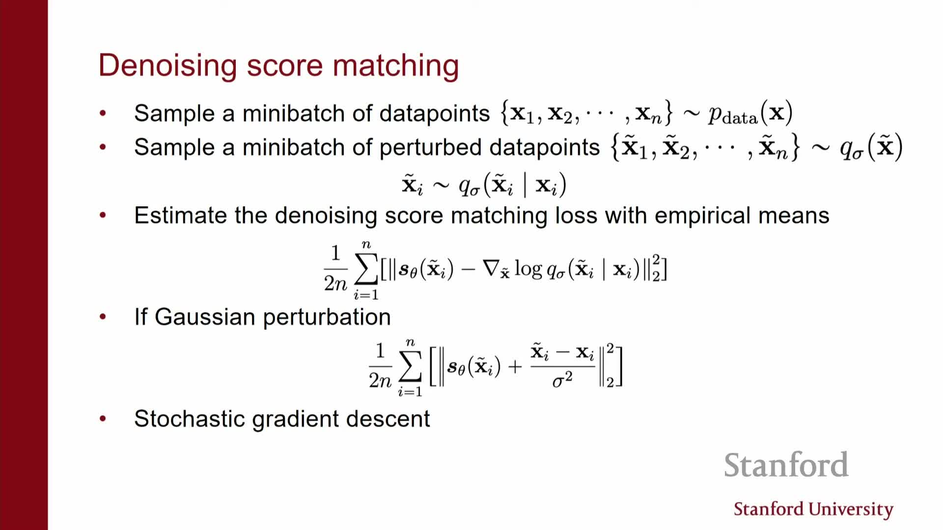 - For Gaussian perturbations the loss reduces to an L2 regression objective: train s_theta(x_tilde) to predict the noise vector (x_tilde − x) scaled by the inverse variance (or equivalently predict the score of the noisy density).