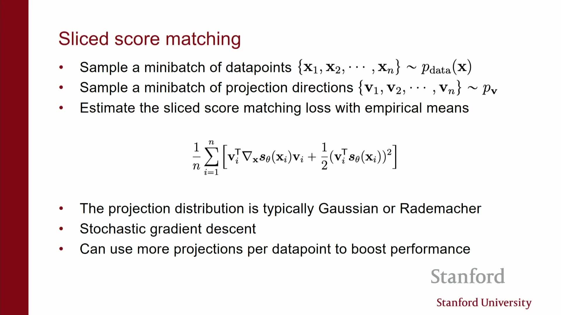 - The sliced Fisher divergence compares these projections; integration by parts still applies and the problematic trace term reduces to Jacobian-vector products (directional derivatives).