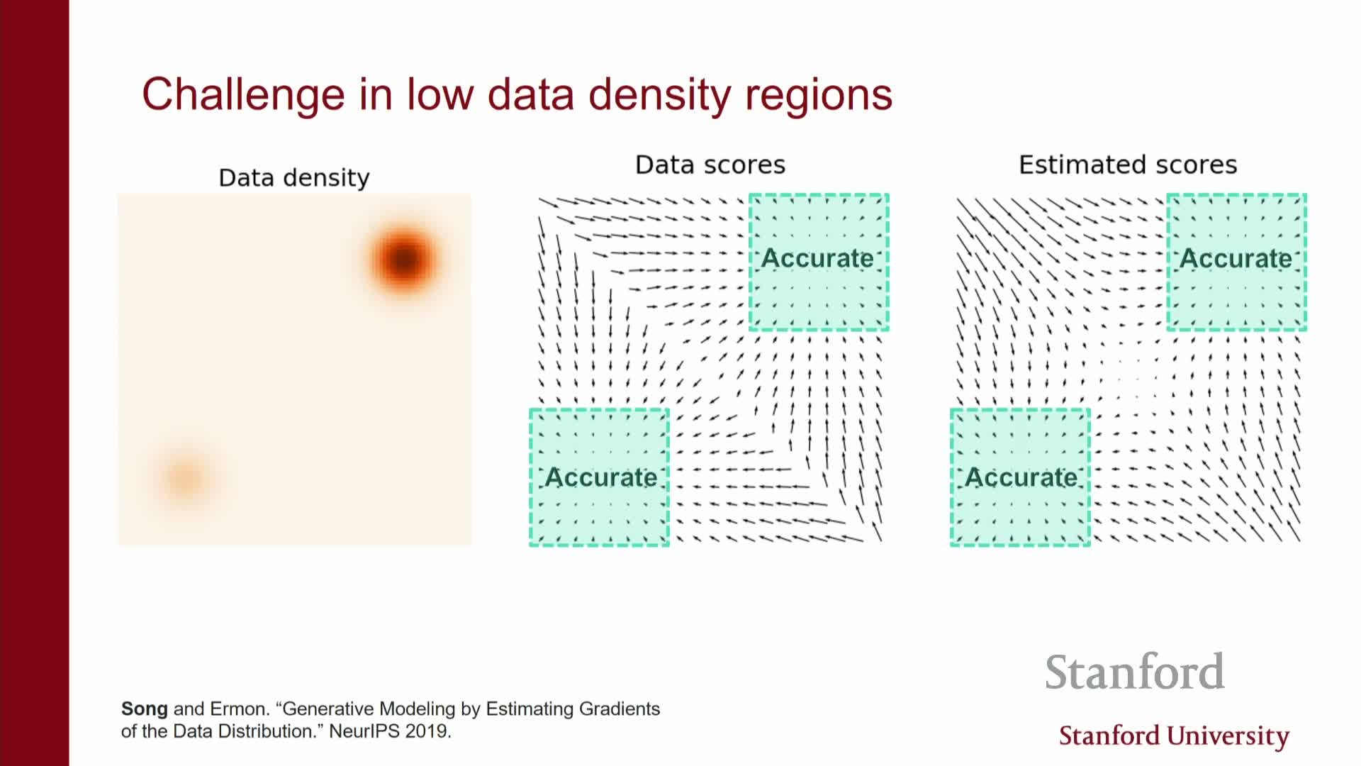 Poor score estimates in low-density regions: finite-data training yields accurate scores only near high-density regions, leaving large gaps with unreliable estimates.