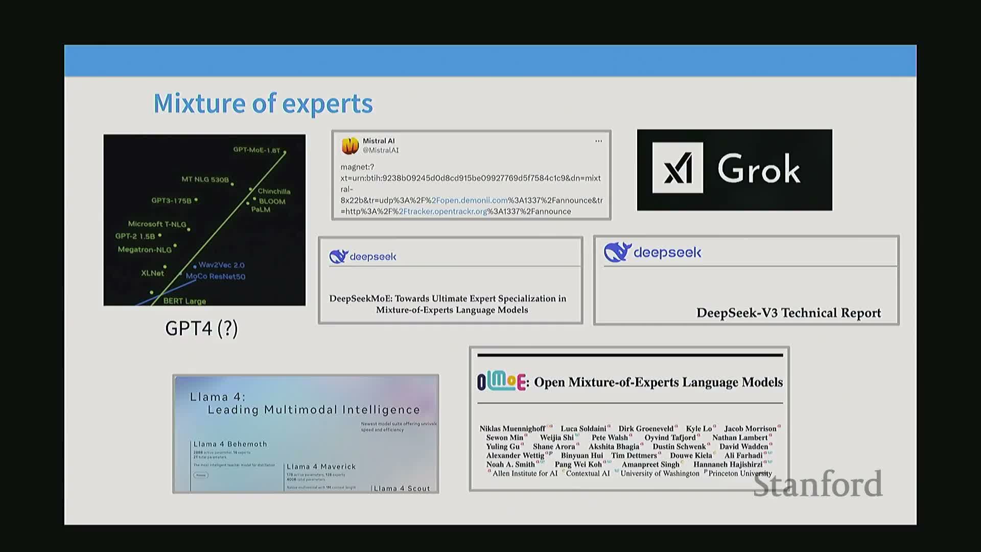 - Early open-source and industry efforts (Quen, DeepSeek, Grok, Llama 4) operationalized MoE and introduced practical engineering patterns