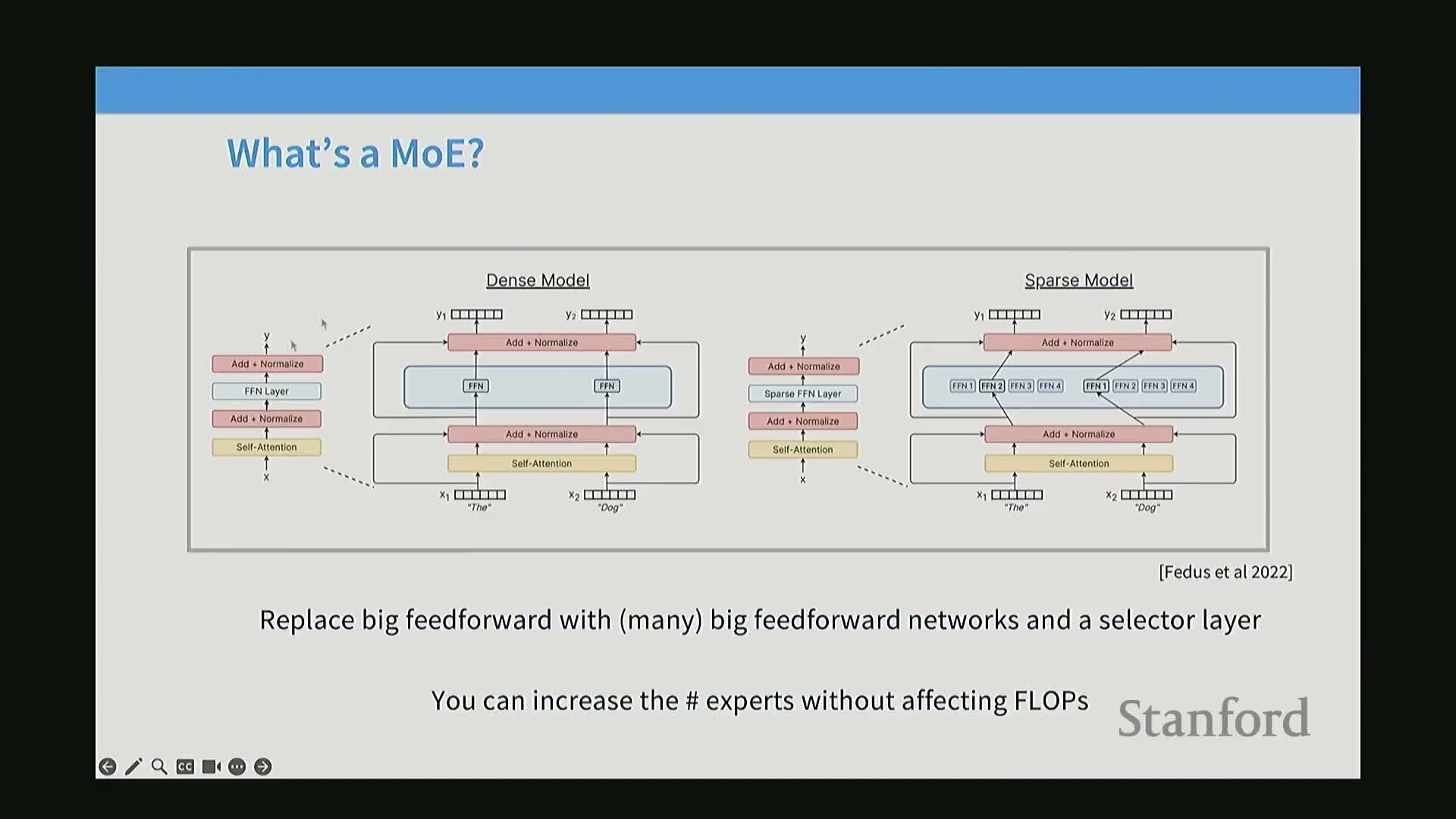 - MoE substitutes a single feed-forward network with multiple smaller experts and a selector to obtain more parameters per FLOP