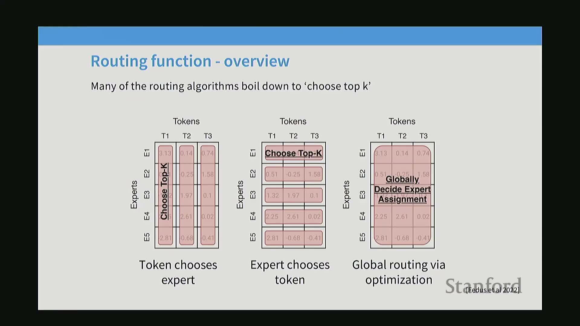- Routing design options include token-choice top-k, expert-choice top-k, and global assignment, with token-choice top-k predominating in practice