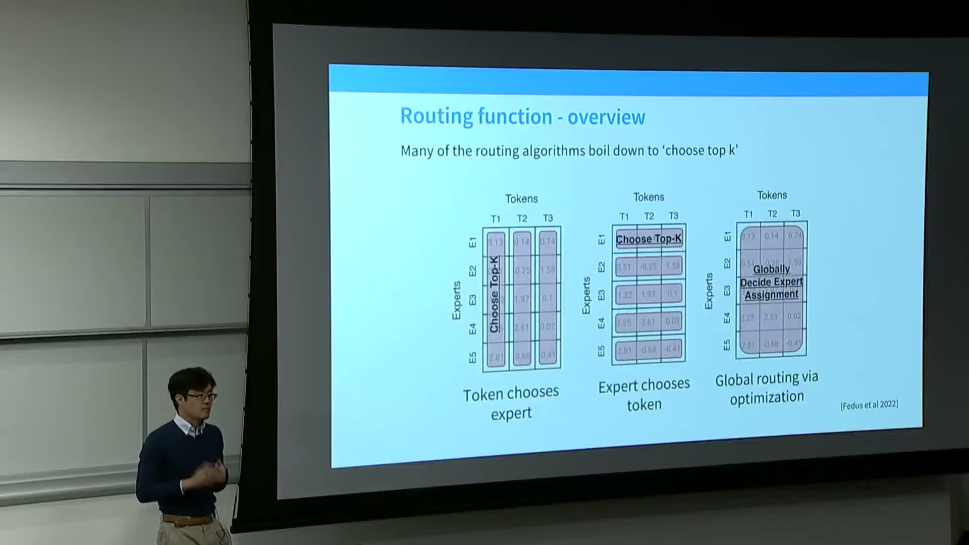 Routing design options include token-choice top-k, expert-choice top-k, and global assignment, with token-choice top-k predominating in practice