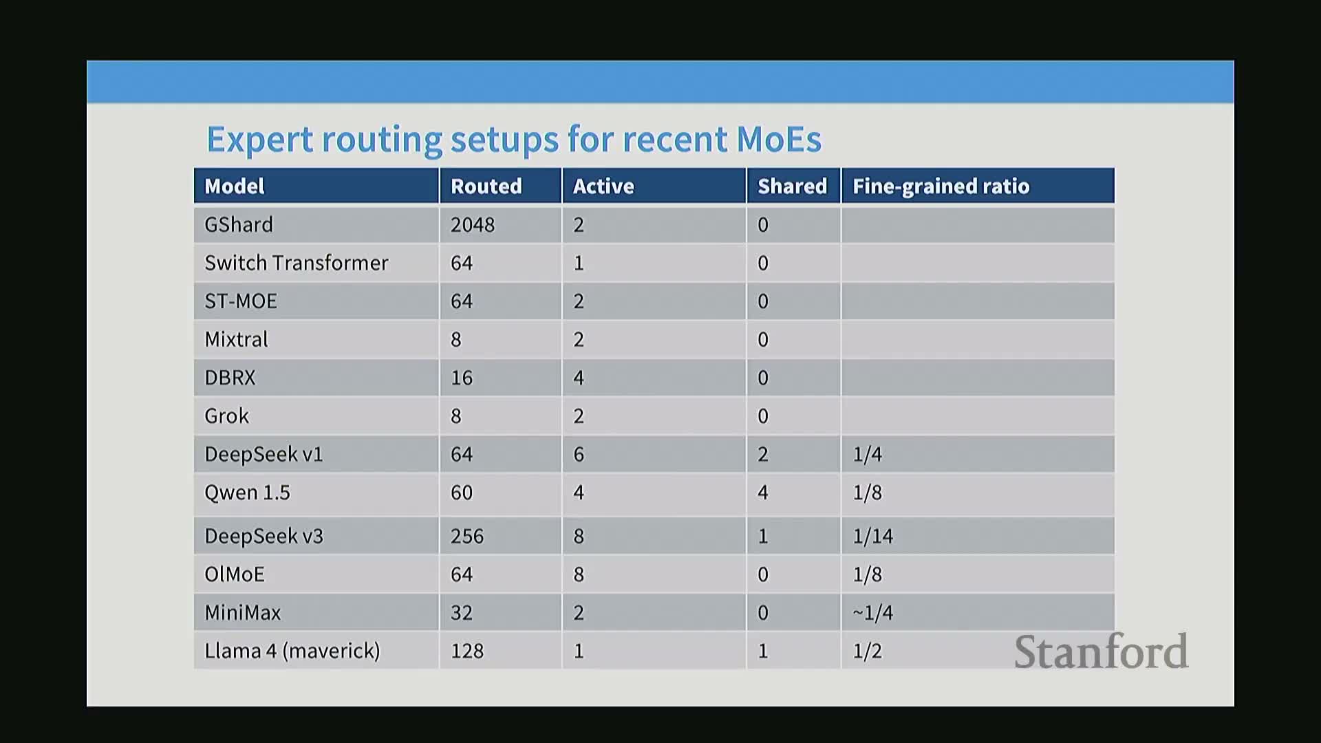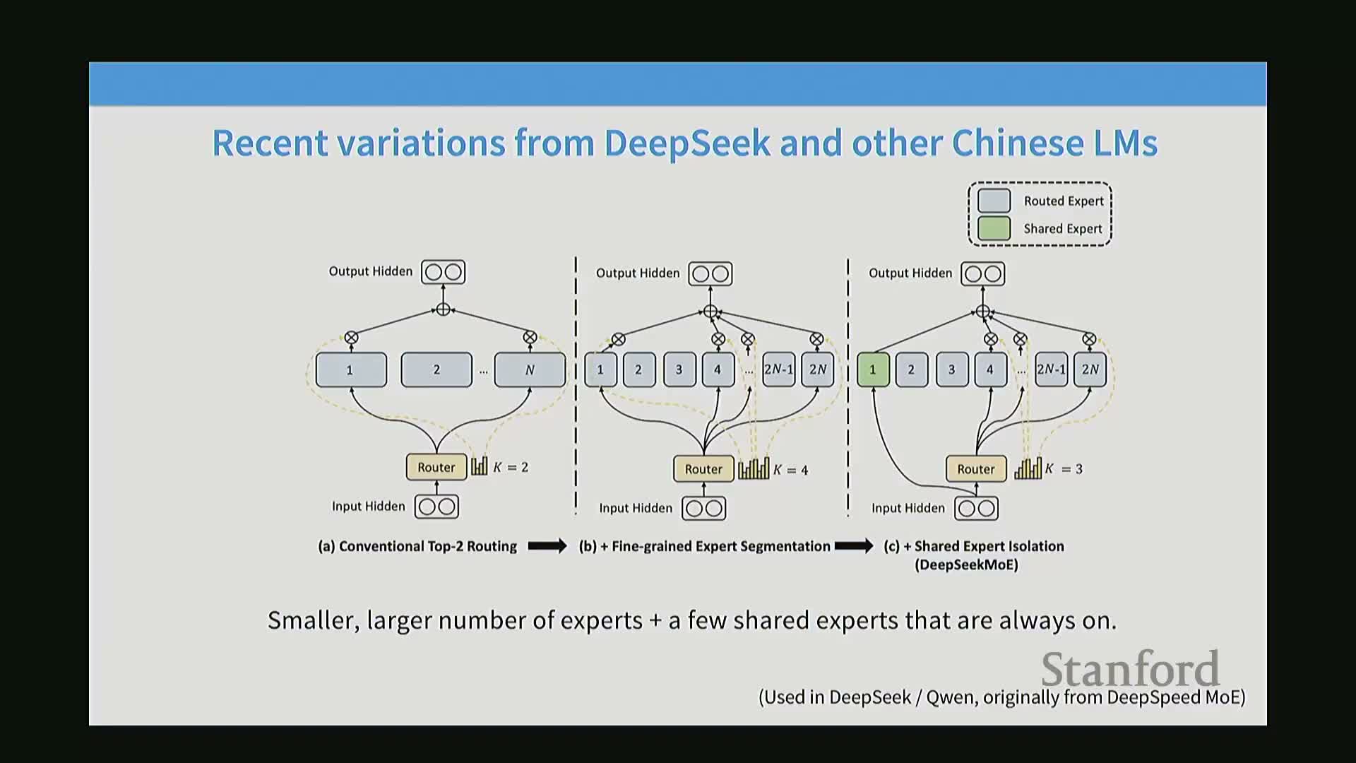 - Typical public configurations: many fine-grained experts (e.g., 64+) with 2–6 active experts per token and sometimes a few shared experts.