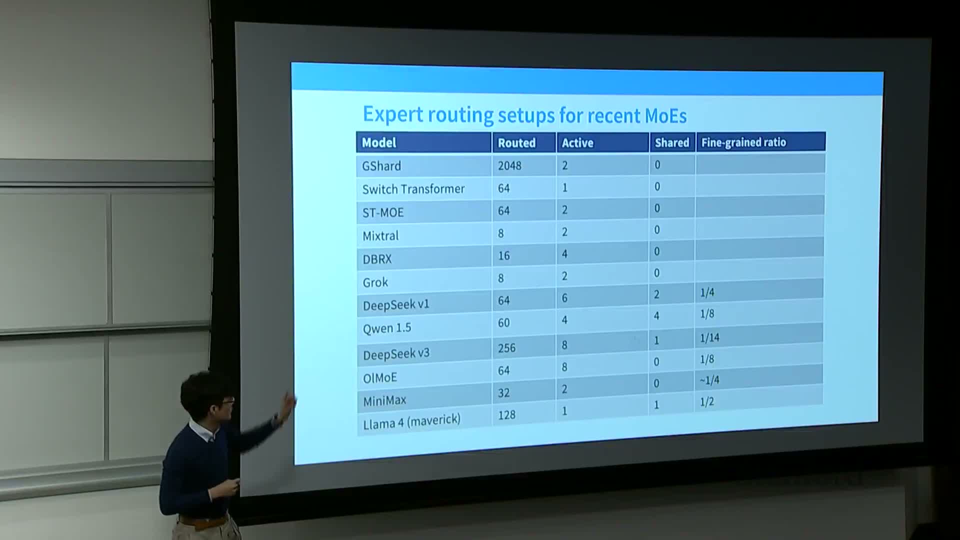 - Common MoE configurations use many fine-grained experts with small per-expert slices and a small number of activated experts per token