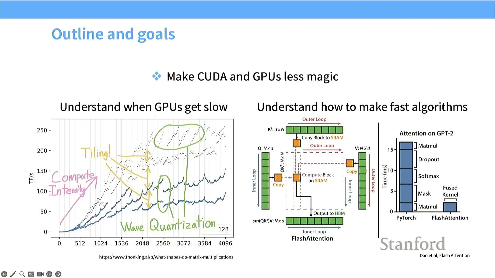 The lecture introduces the goals: demystify CUDA / GPUs and equip practitioners to accelerate model components with GPU-aware algorithms and implementations.