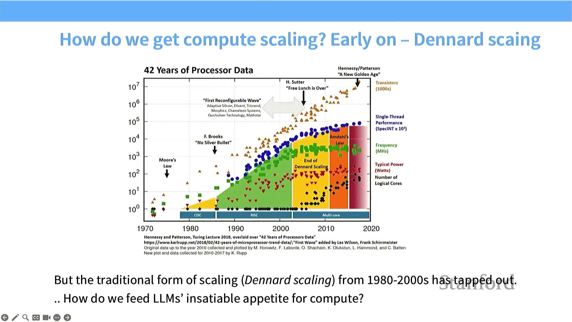 Compute scaling and historical semiconductor trends explain why parallel hardware matters for modern deep learning workloads.