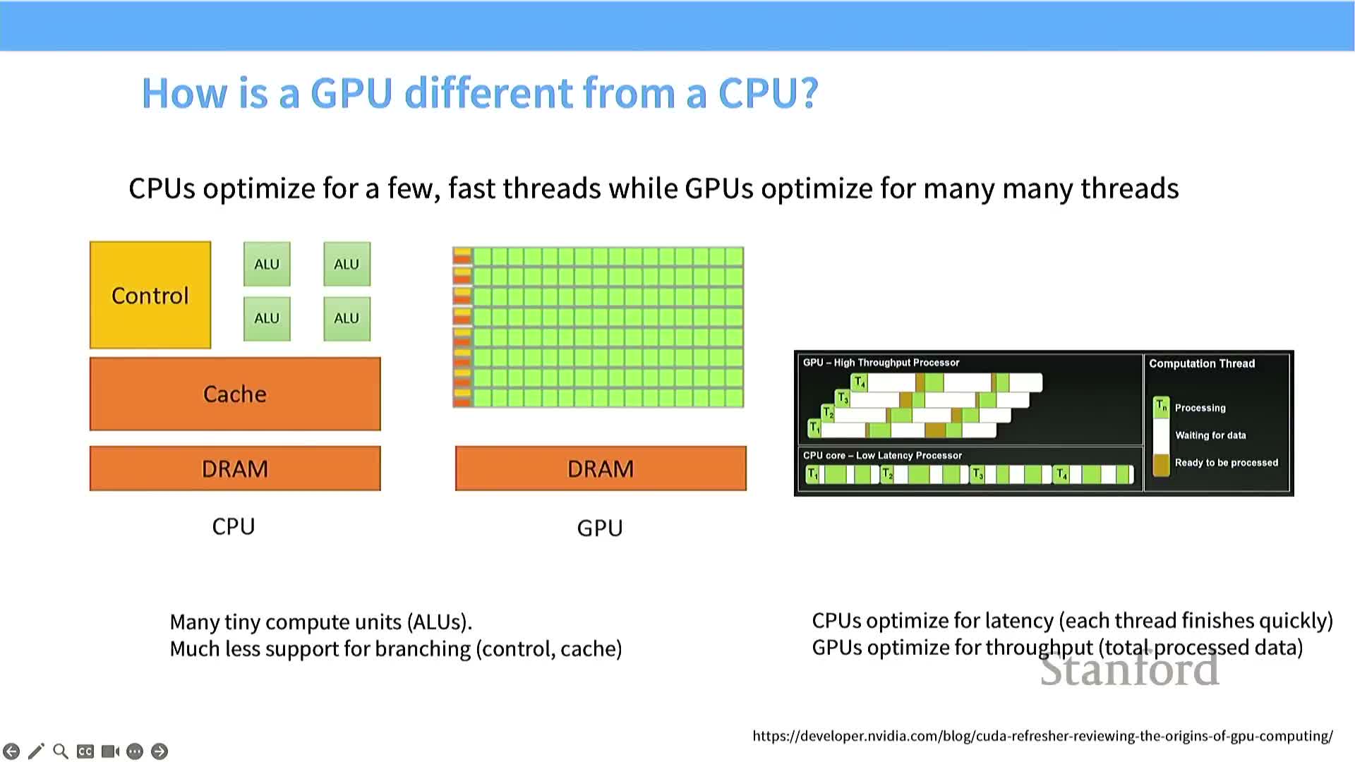 CPUs and GPUs are architected for different goals, which dictates different programming and algorithmic approaches.