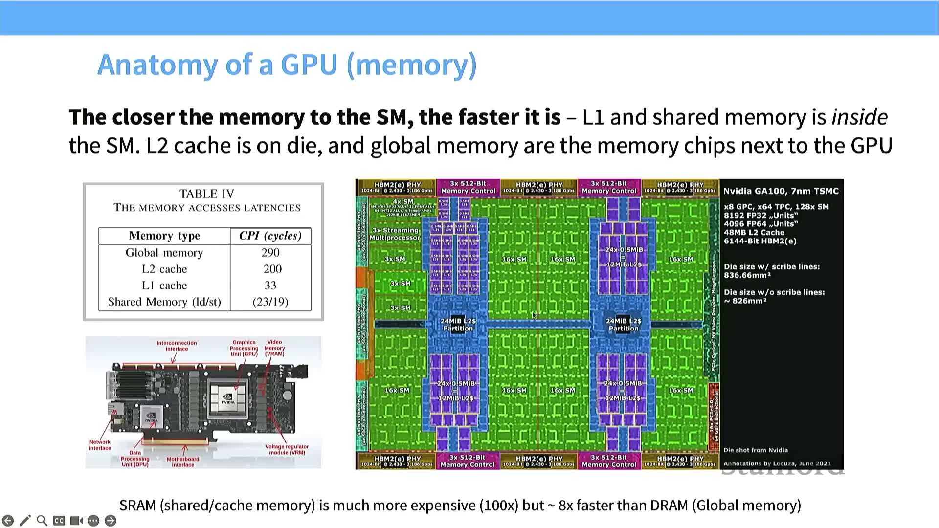 - Physical proximity matters: on‑SM accesses take tens of cycles, global memory accesses can take hundreds of cycles.
