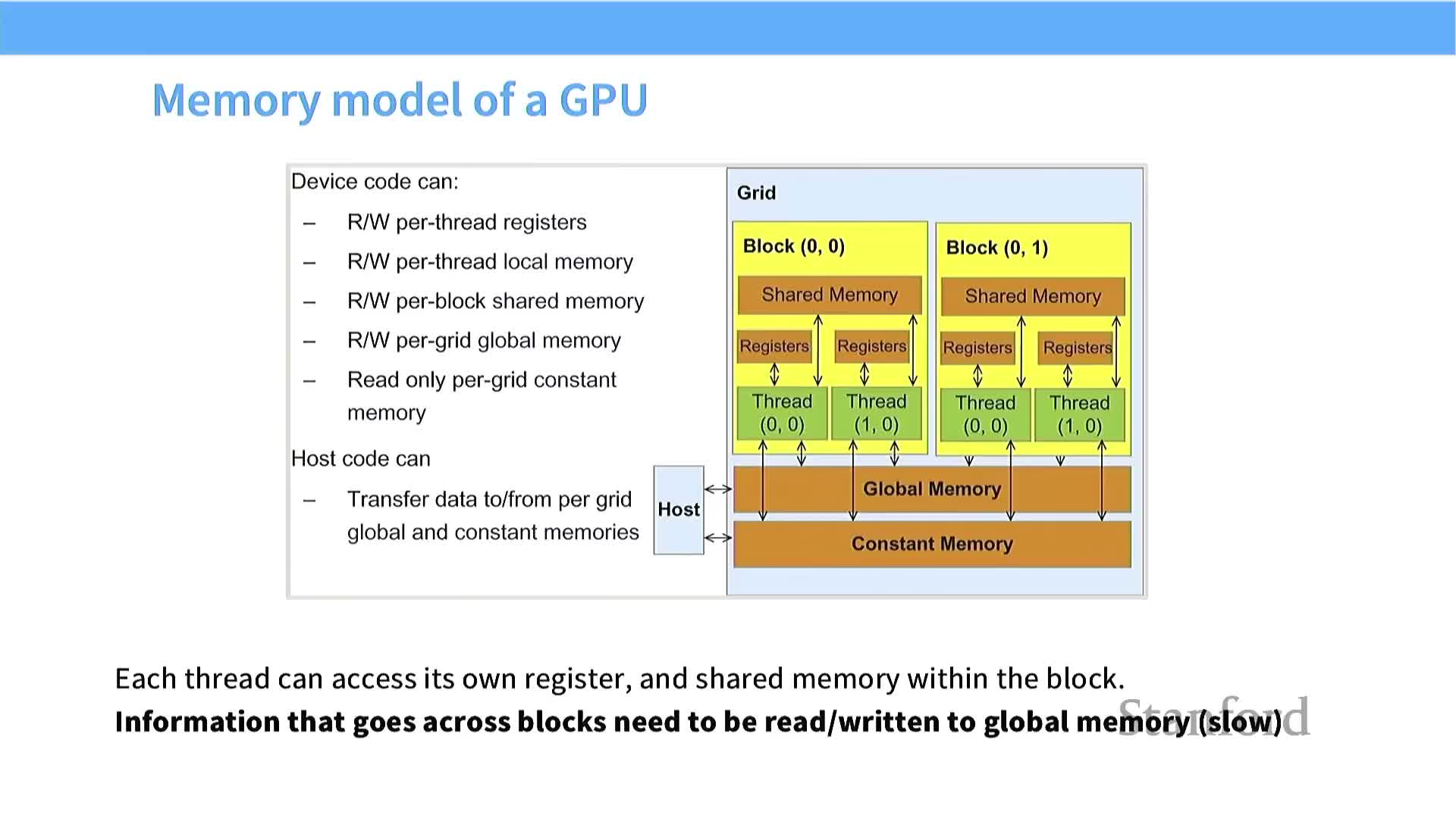 The GPU programming model exposes a hierarchy of logical memories — use each level for its intended purpose.