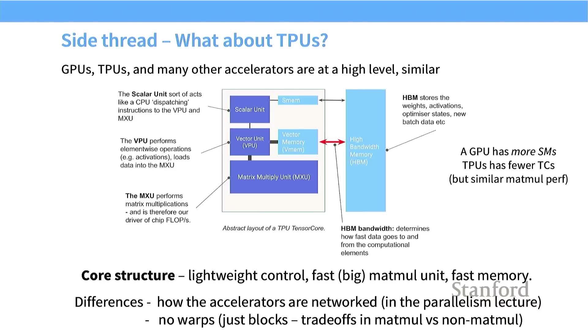 TPUs share several high-level concepts with GPUs but emphasize specialized matrix hardware.