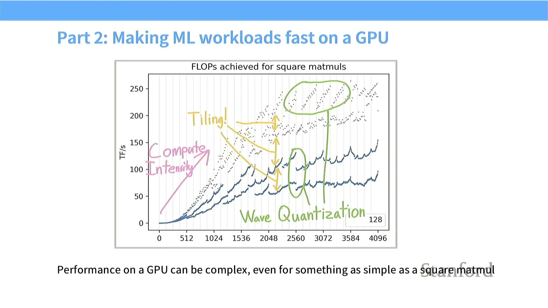 - Small changes in matrix dimension can change the number of tiles from evenly mapping across SMs to leaving many SMs idle while a few execute leftover tiles, producing large throughput drops.