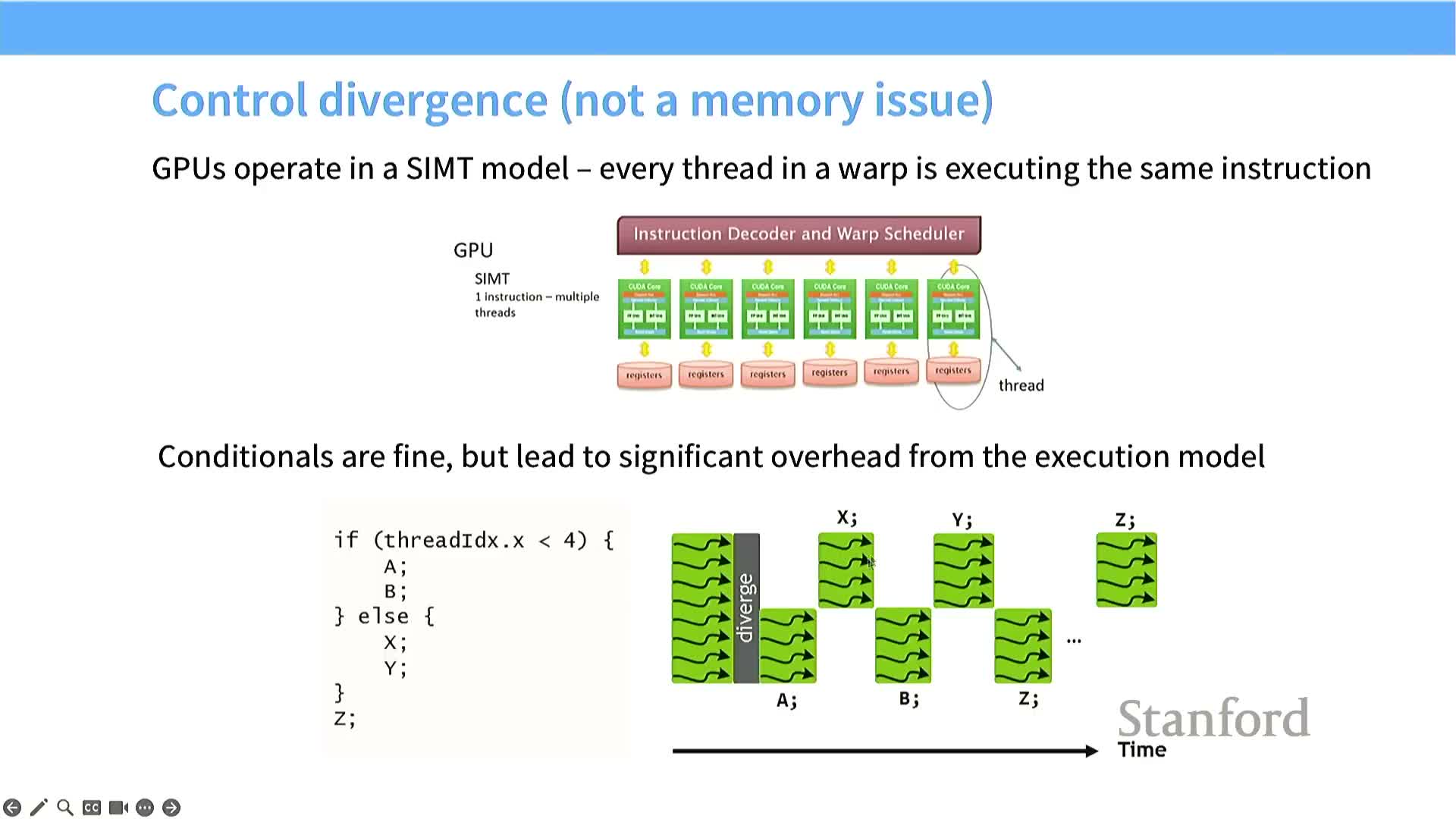 - All threads in a warp must follow the same instruction stream; divergence penalizes utilization.
