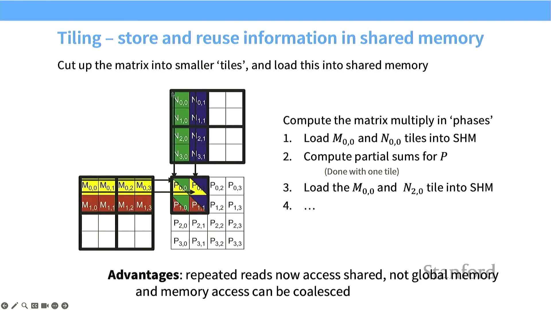 - Tiling reduces global reads by a factor proportional to the tile dimension T, increasing arithmetic intensity.
