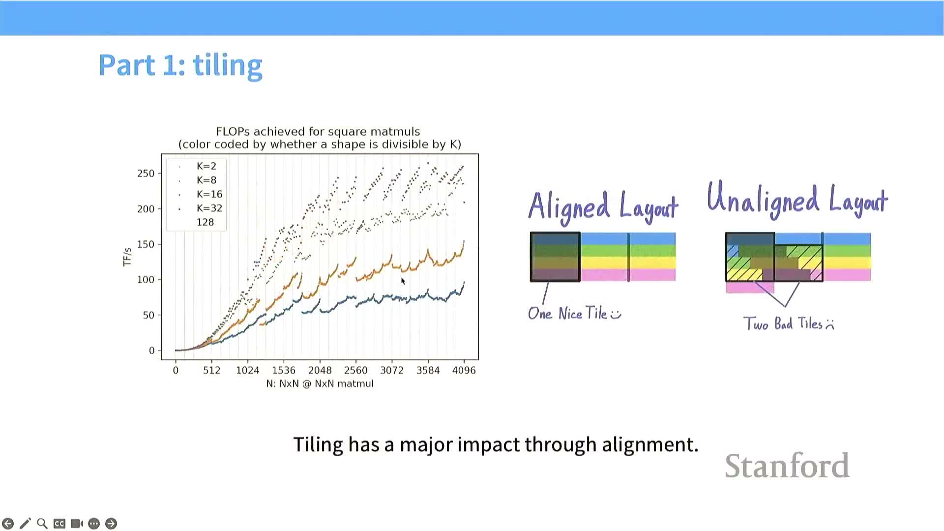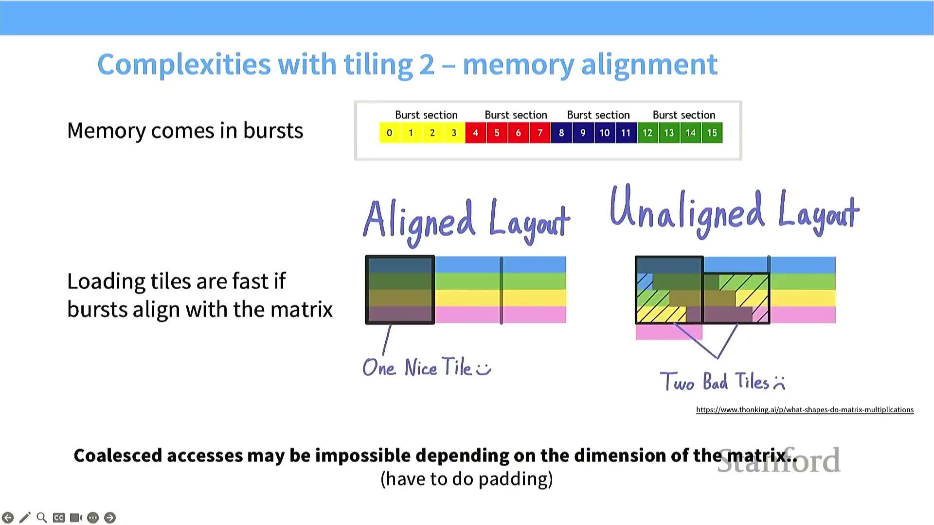 Misaligned tiles can break DRAM burst coalescing and double memory transactions.
