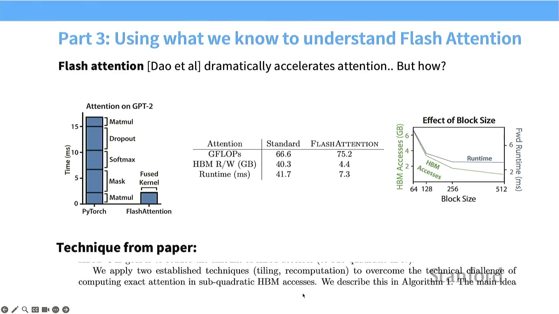 - Flash Attention uses tiling and recomputation to reduce HBM accesses for attention