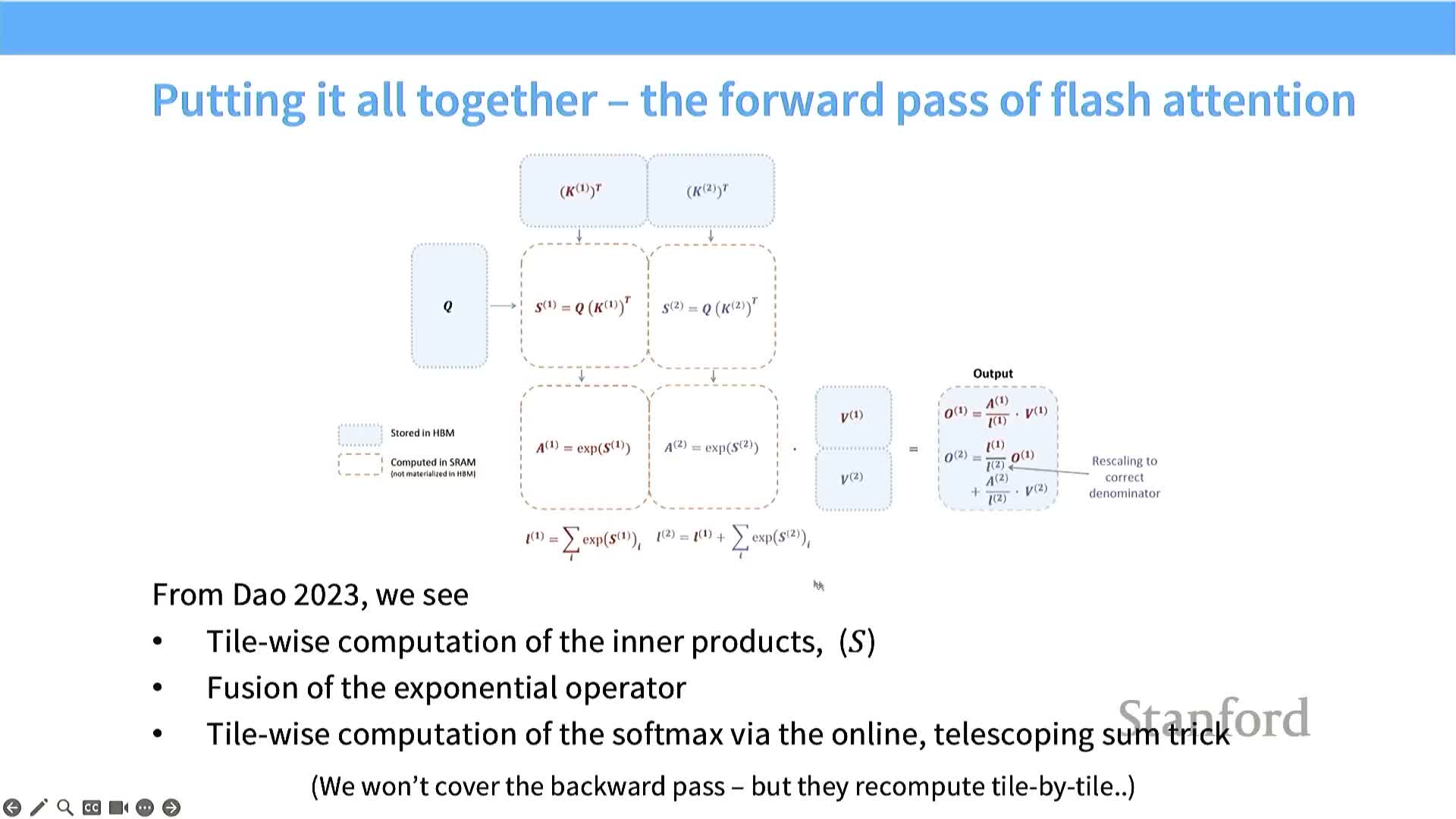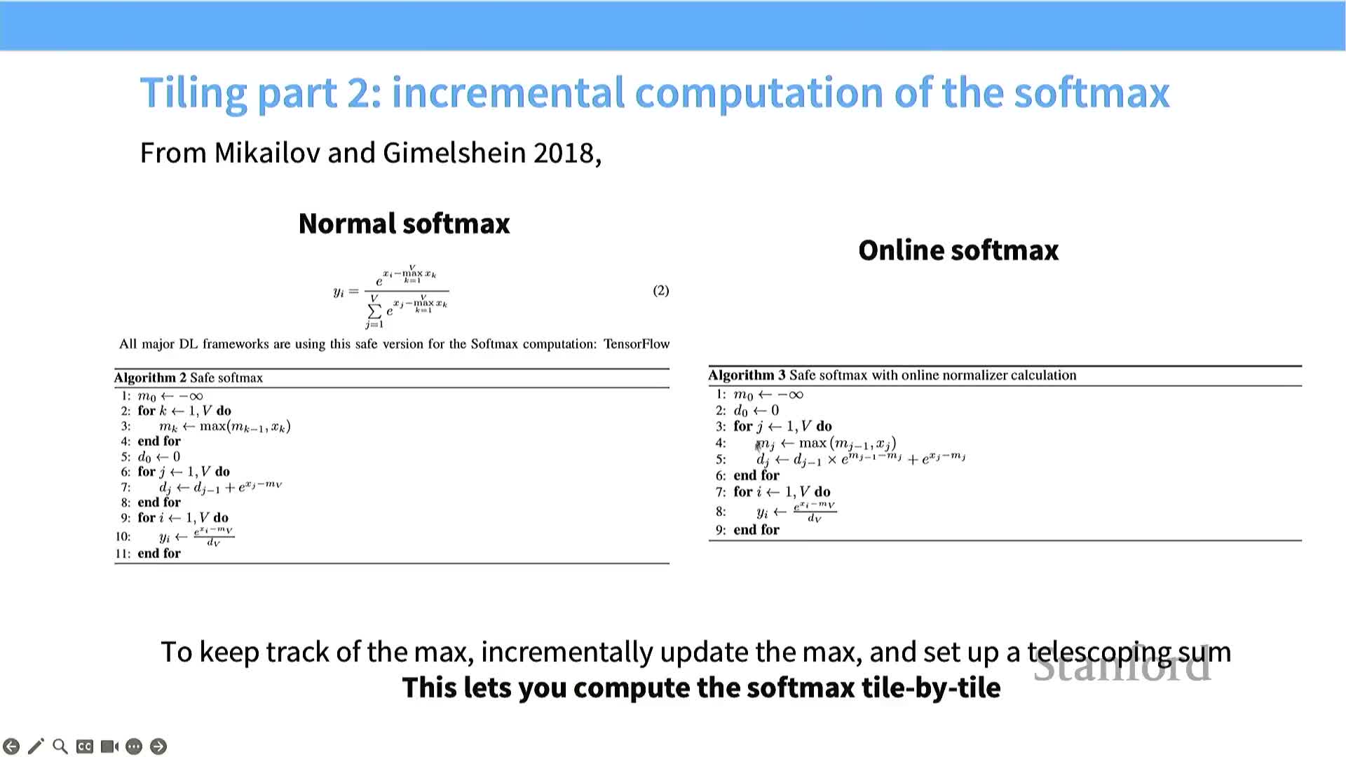 - This telescoping/online formulation preserves numerical stability and computes the normalization factor from per-tile state, avoiding the need to store full N×N logits in global memory.