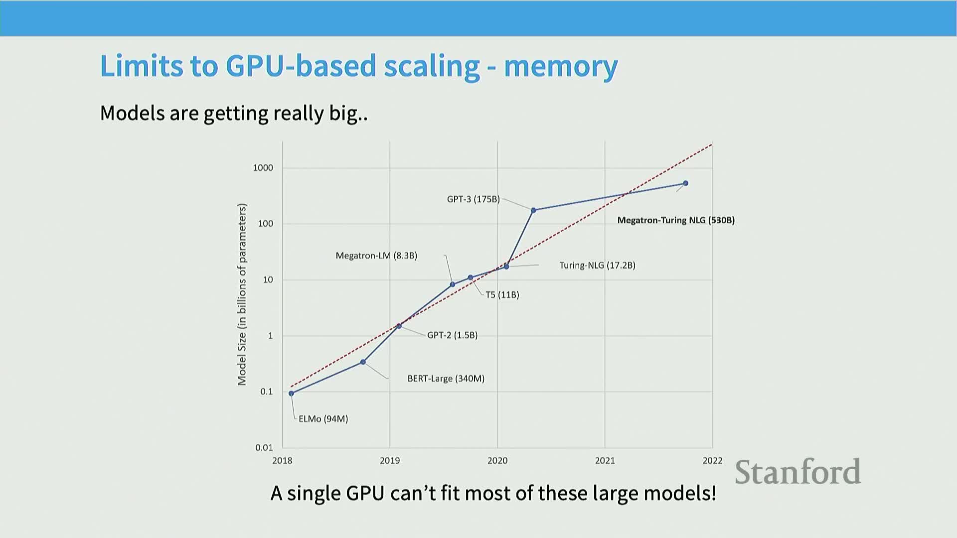 Model parameter counts are growing faster than individual accelerator memory, so billions-parameter models routinely exceed a single GPU’s capacity and must be distributed across devices.